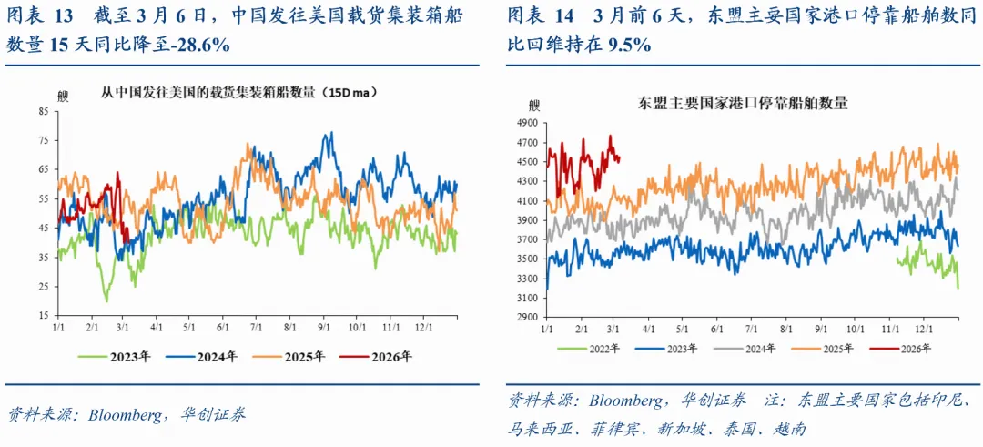 中美之间直接贸易流量:中国发往美国载货船舶数量同比降幅扩大。截止3月6日,中国发往美国载货集装箱船数量15天同比降至-28.6%,1-2月平均同比为-3.3%,去年12月-14.3%。