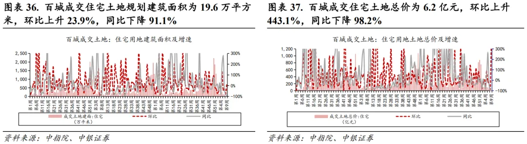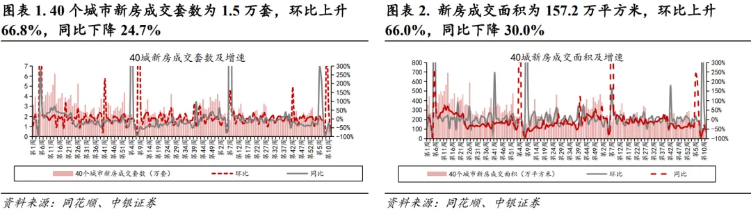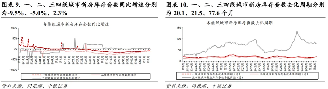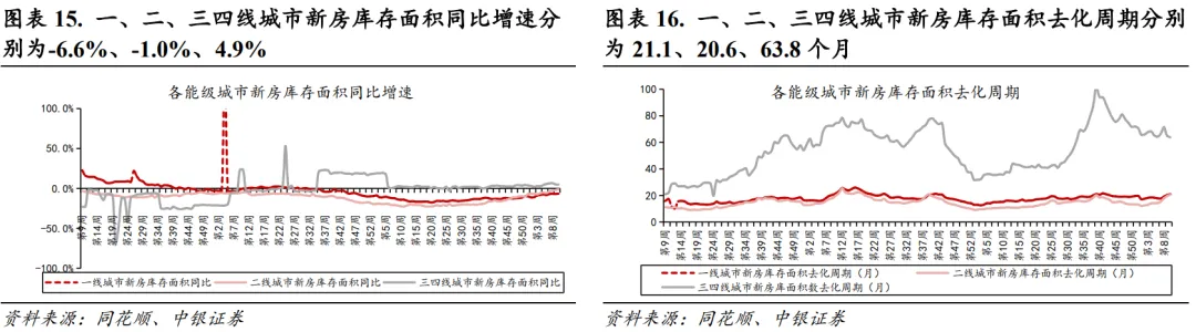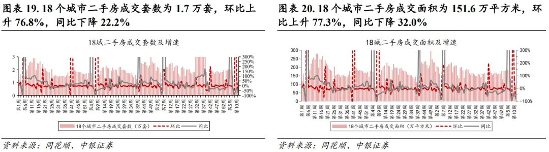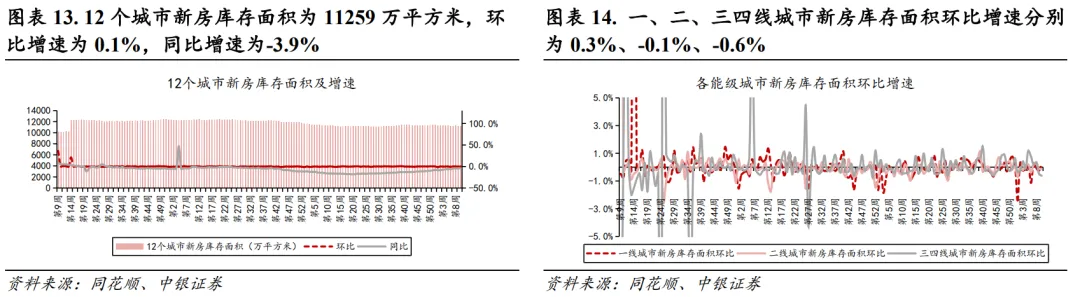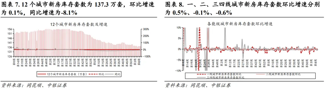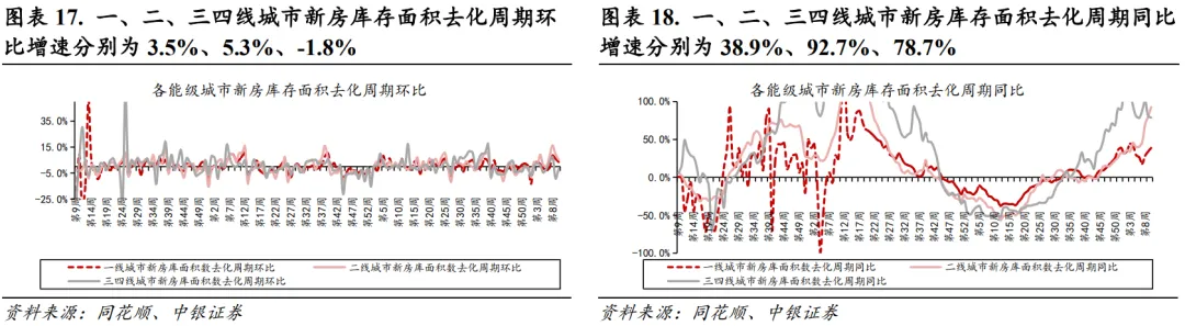 新房成交面积环比由负转正、同比降幅收窄;二手房成交面积环比由负转正,同比降幅收窄;新房库存面积环比上涨,同比下降;去化周期同环比均上涨。