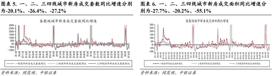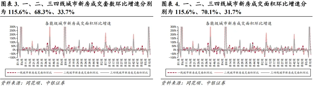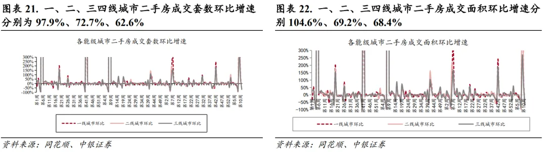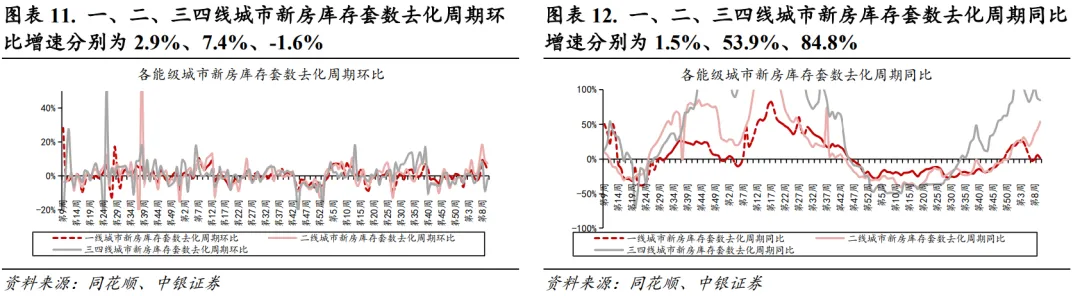 本周(第10周:2月28日-3月6日)相比于8-9周,新房成交面积环比由负转正、同比降幅收窄;二手房成交面积环比由负转正、同比降幅收窄;新房库存面积环比由负转正、同比降幅收窄;一、二线城市新房库存面积去化周期环比上升、三四线城市环比下降,同比均上升。