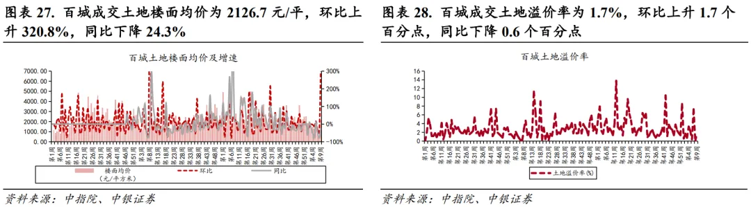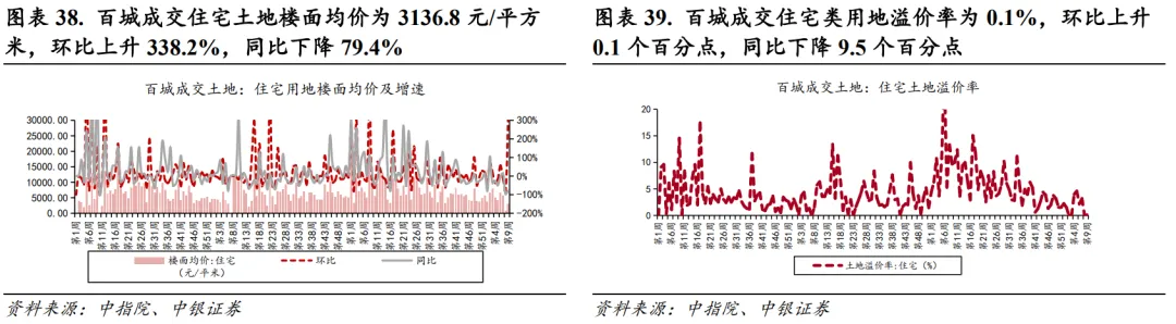 土地市场环比均量价齐涨,同比均量价齐跌;溢价率环比上涨,同比下降。第9周百城全类型成交土地规划建面为1418.0万平,环比上升1293.6%,同比下降16.0%;成交总价301.6亿元,环比上升5763.9%,同比下降36.4%;楼面均价2127元/平,环比上升320.8%,同比下降24.3%;土地溢价率为1.7%,环比上涨1.7个百分点,同比下降0.6个百分点。