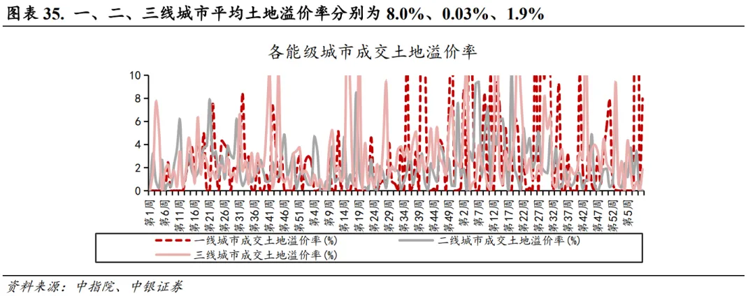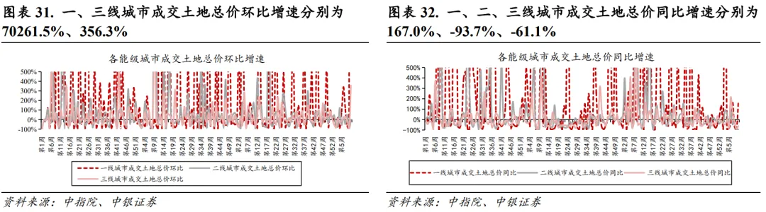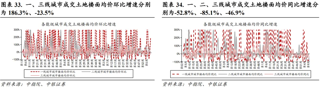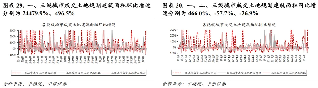 从城市能级来看,一、二、三线城市成交土地规划建筑面积分别为489.1、333.8、595.1万平方米,一、三线城市环比增速分别为24479.9%、496.5%,一、二、三线城市同比增速分别为466.0%、-57.7%、-26.9%;一、二、三线城市成交土地总价分别为259.5、20.3、21.8亿元,一、三线城市环比增速分别为70261.5%、356.3%,一、二、三线城市同比增速分别为167.0%、-93.7%、-61.1%;一、二、三线城市平均楼面价分别为5305.1、607.7、366.0元/平,一、三线城市环比增速分别为186.3%、-23.5%,一、二、三线城市同比增速分别为-52.8%、-85.1%、-46.9%;一、二、三线城市平均土地溢价率分别为8.0%、0.03%、1.9%,一线城市环比上升8.0个百分点、三线城市环比上升1.9个百分点,一、三线城市同比分别上升8.0、1.5个百分点、二线城市同比下降7.1个百分点。
