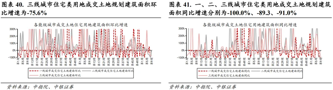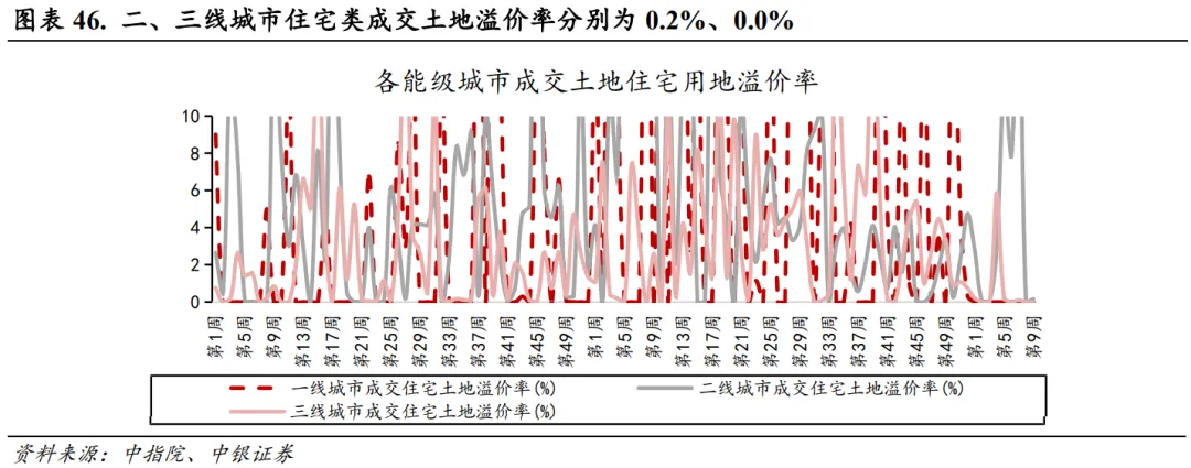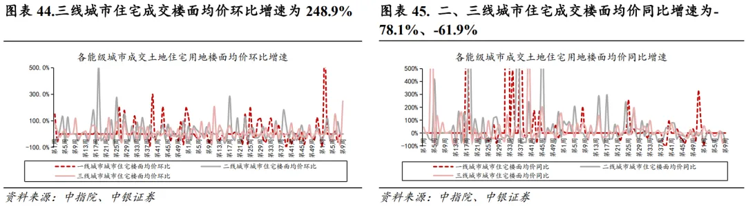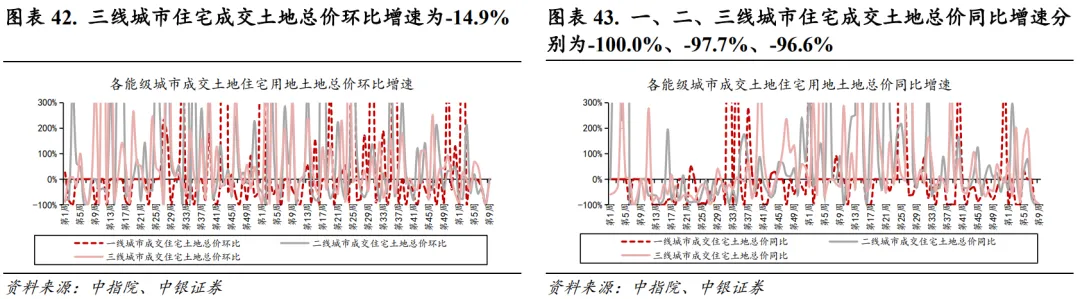 从不同城市能级的住宅类土地市场情况来看,本周一、二、三线土地建筑面积分别为0.0、15.8、3.9万平米,三线城市环比增速为-75.6%,一、二、三线城市同比增速分别为-100.0%、-89.3、-91.0%;一、二、三线城市住宅类成交土地总价分别为0.0、5.2、1.0亿元,三线城市环比增速为-14.9%,一、二、三线城市同比增速分别为-100.0%、-97.7%、-96.6%;二、三线城市住宅类平均楼面价分别为3293、2497元/平,三线城市环比增速为248.9%,二、三线城市同比增速分别为-78.1%、-61.9%;二、三线城市平均住宅类成交土地溢价率分别为0.2%、0.0%,三线城市环比增速不变,二、三线城市同比下降14.3、2.6个百分点。