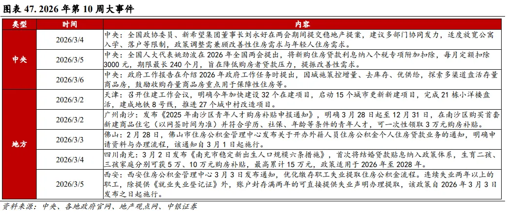 本文来自中银证券研究部于2026年3月10日发布的报告《新房、二手房成交同比降幅收窄;政府工作报告首次提出“加强初婚初育家庭住房保障”——房地产行业第10周周报(2026年2月28日-2026年3月6日)》。欲了解详细全文内容,请阅读报告原文。夏亦丰S1300521070005