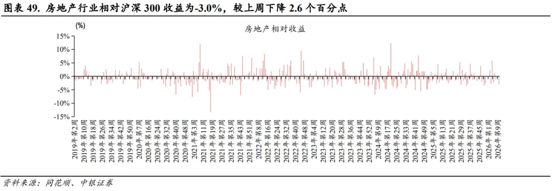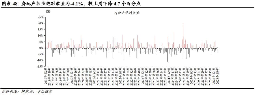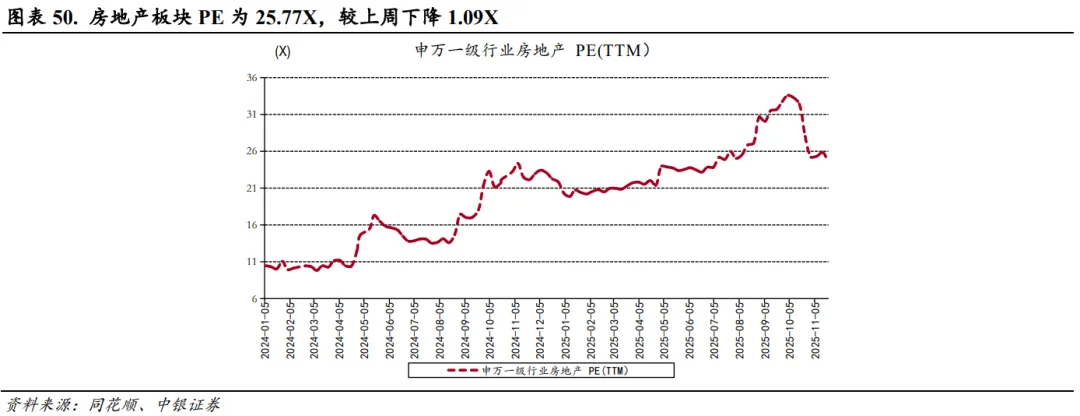 板块相对收益有所下降。房地产行业绝对收益为-4.1%,较上周下降4.7pct,房地产行业相对收益(相对沪深300)为-3.0%,较上周下降2.6pct。房地产板块PE为25.77X,较上周下降1.09X。