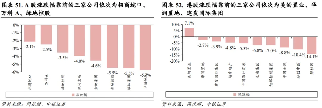 在我们重点跟踪房地产行业股票中,本周A股涨跌幅靠前的三家公司依次为招商蛇口、万科A、绿地控股,涨跌幅分别为-2.1%、-2.5%、-3.5%,涨跌幅靠后的三家公司依次为华侨城A、滨江集团、新城控股,涨跌幅分别为-5.7%、-5.5%、-5.5%。港股涨跌幅靠前的三家公司依次为美的置业、华润置地、建发国际集团,涨跌幅分别为7.1%、-2.7%、-3.9%,涨跌幅靠后的三家公司依次为碧桂园、融创中国、中国金茂,涨跌幅分别为-14.1%、-10.4%、-8.8%。