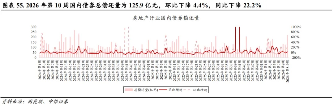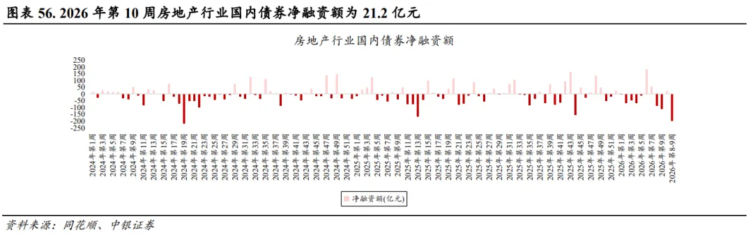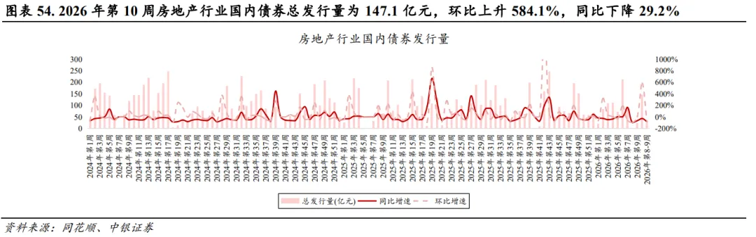 本周房企国内债券总发行量环比上升、同比下降,总偿还量同环比均下降。2026年第10周(2月28日-3月6日)房地产行业国内债券总发行量为147.1亿元,环比上升584.1%,同比下降29.2%(前值:-86.2%)。总偿还量为125.9亿元,环比下降4.4%,同比下降22.2%(前值:20.7%);净融资额为21.2亿元。