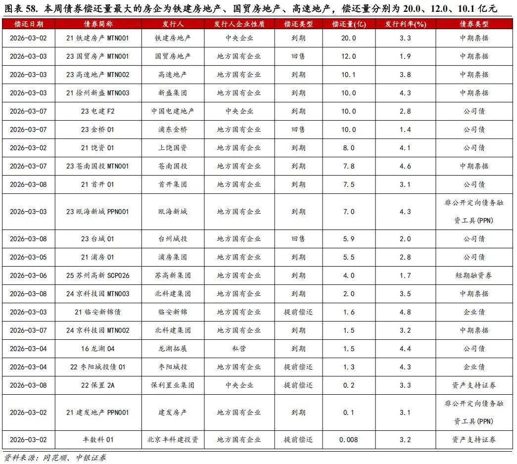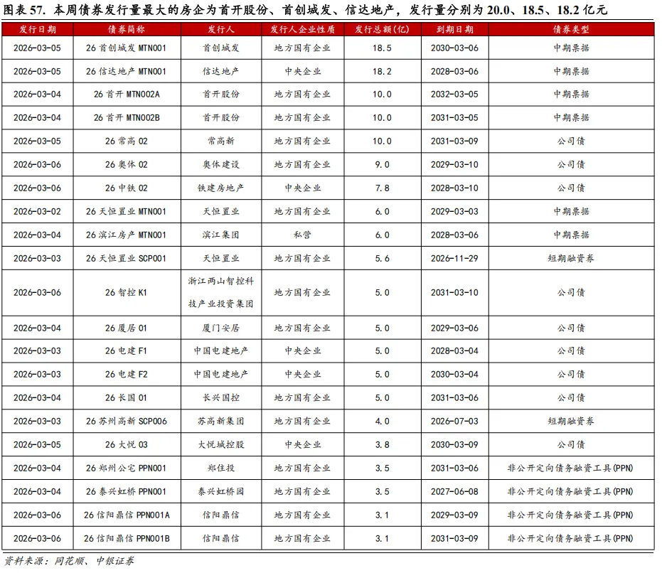 具体来看,本周债券发行量最大的房企为首开股份、首创城发、信达地产,发行量分别为20.0、18.5、18.2亿元。本周债券偿还量最大的房企为铁建房地产、国贸房地产、高速地产,偿还量分别为20.0、12.0、10.1亿元。