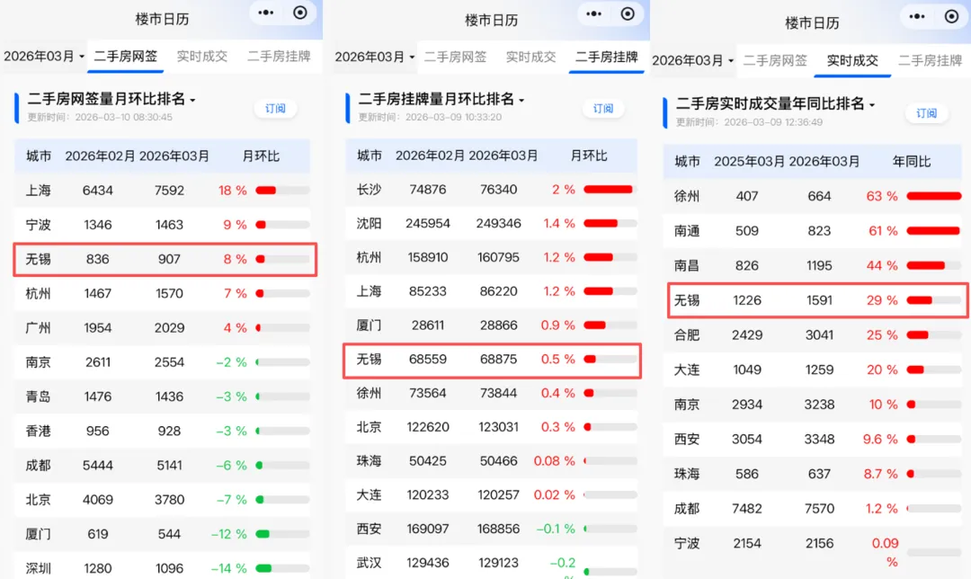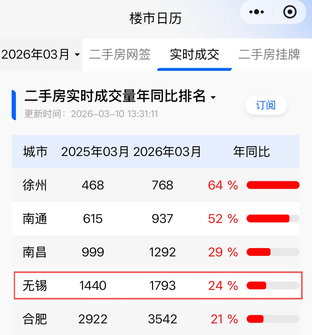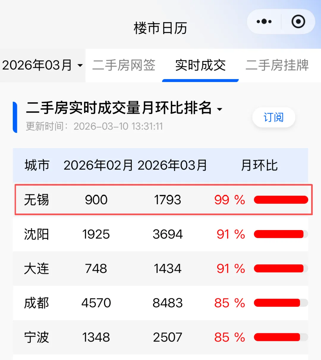 根据冰山指数,截至今日13:31,无锡3月二手房成交1793套,相比2月同时期的900套,环比暴涨99%,涨幅领跑全国重点城市,强势登顶榜首!