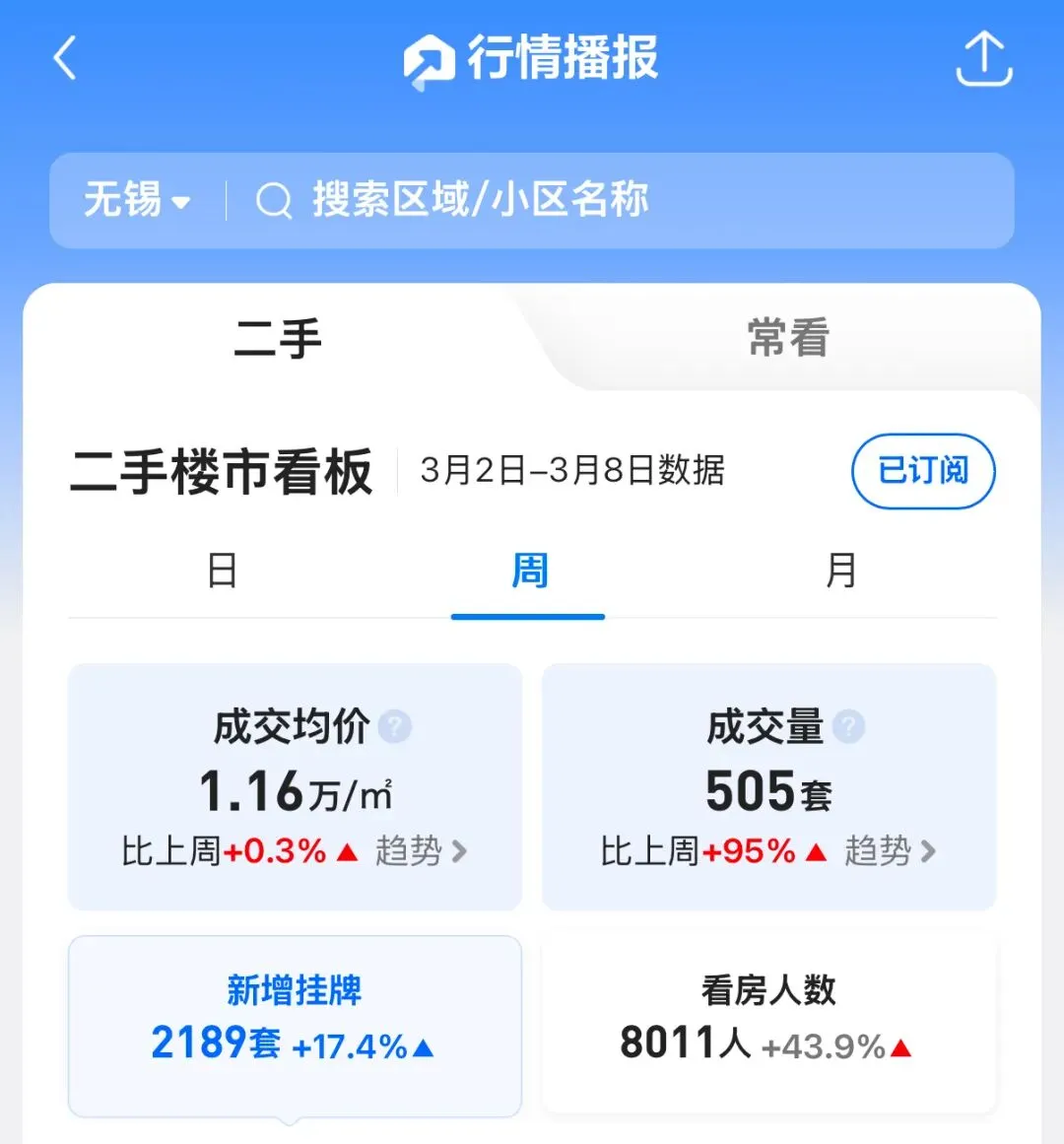 根据贝壳最新数据,上周无锡二手房成交量达505套,环比暴涨95%;成交均价为1.16万/㎡,增幅0.3%,稳中有升;新增挂牌2189套,上涨17.4%;看房人数8011人,暴涨43.9%。市场热度,肉眼可见地在攀升!