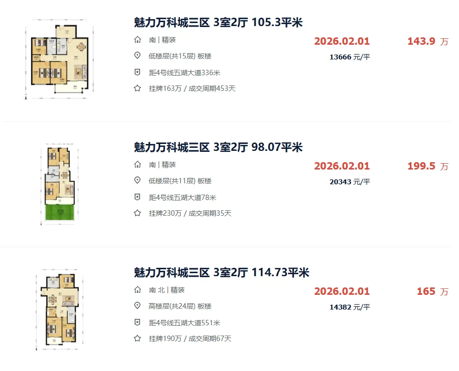 魅力万科城三区,同样是一天成交3套,建面约98-114.73㎡户型均有。
