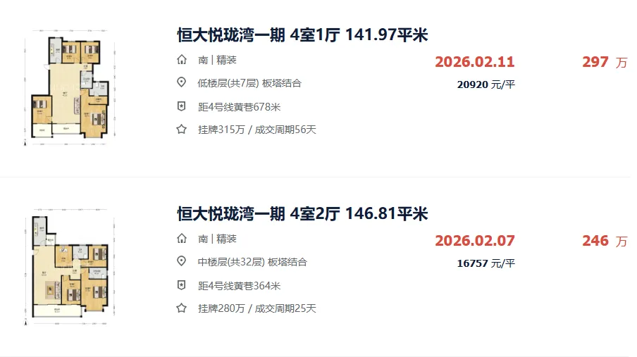 恒大悦珑湾一期,一周时间有2套房源成交,洋房、高层都有。小区目前有69套房源挂牌,近30天带看174次,选择较多带看也多。