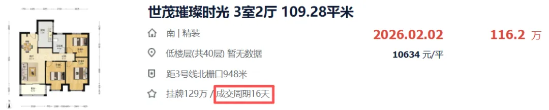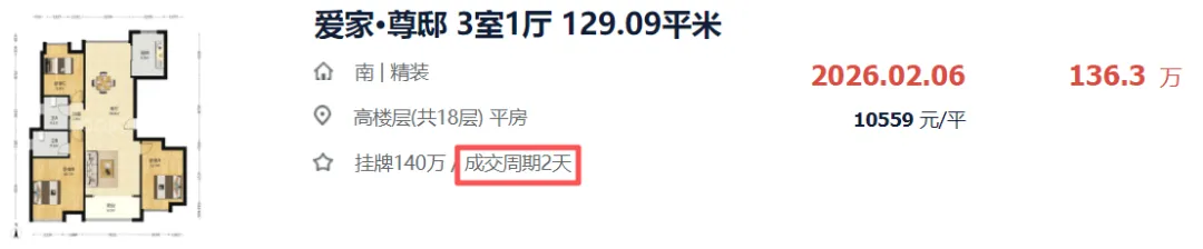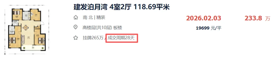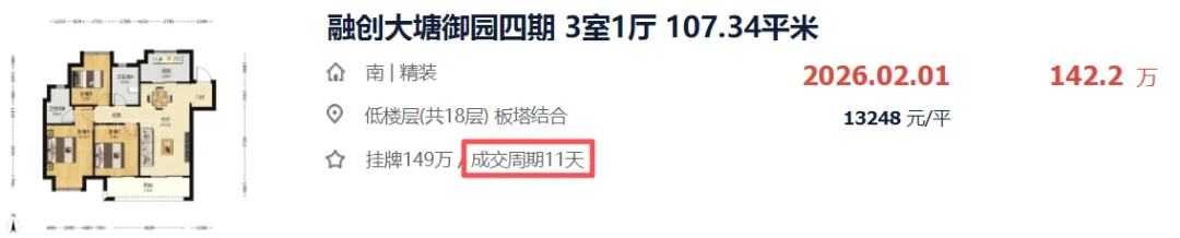 成交量暴涨的同时,成交周期也在疯狂缩短,甚至有小区挂牌1天就成交!华夏东城一品,建面约124.49㎡四房,挂牌仅1天便成交!路劲梅都府,建面约137.22㎡四室,同样挂牌仅1天便成交!清扬新村,建面约39.57㎡一室一厅户型,挂牌46万,最终以42.5万成交,成交周期仅2天!成交均价约10741元/㎡。爱家·尊邸,建面约129.09㎡三房,挂牌仅2天便闪电成交!融创运河壹号府一期,建面约53.89㎡毛坯,挂牌5天便成交!百郦华庭,一套建面约140㎡的三室,挂牌5天便找到买家。融创大塘御园四期,一套建面约107.34㎡三室,成交周期11天!美的云开东方,一套建面约107㎡三室两厅房源,挂牌13天成交。世茂璀璨时光,一套建面约109.28㎡三房,成交周期仅16天。建发泊月湾,一套建面约118.69㎡精装洋房,挂牌28天成交,作为次新房小区,一个月内出手,流速相当快了。金三开局,无锡二手房市场表现出明显的回暖迹象,热门小区的成交周期正在缩短。