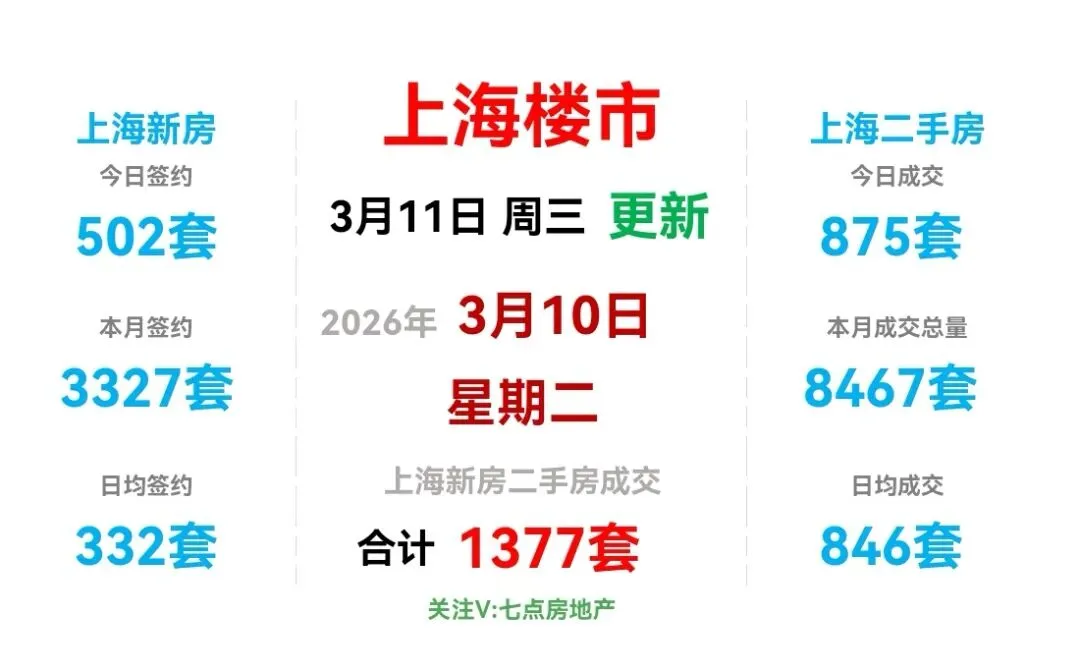 🏡昨日(3月10日,周二),上海二手房成交875套,较前一日增加5套(增幅0.57%),成交面积66342.4m²,套均面积75.82m²。
