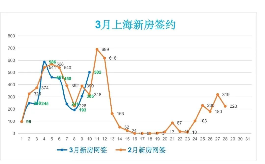 🏠昨日(3月10日,周二),上海新房签约502套,较前一日增加197套(增幅64.59%),日签约面积4.41万m²,套均面积87.85m²。