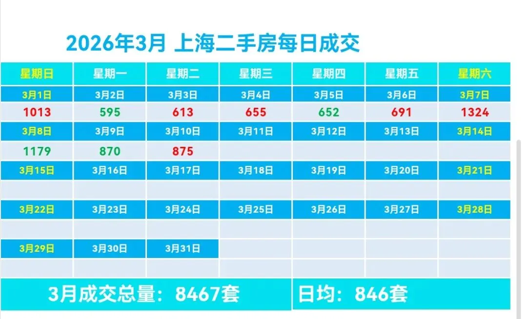 🏡3月,上海二手房成交量累计8467套,日均成交846套,较上个月日均增加442套(增幅109.41%)。