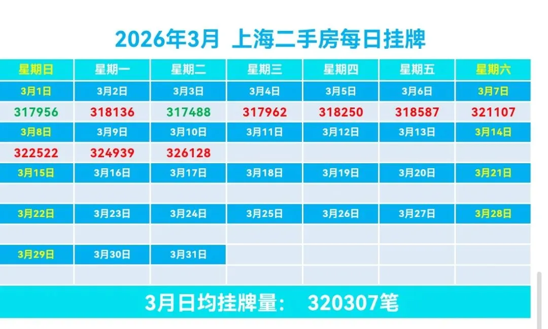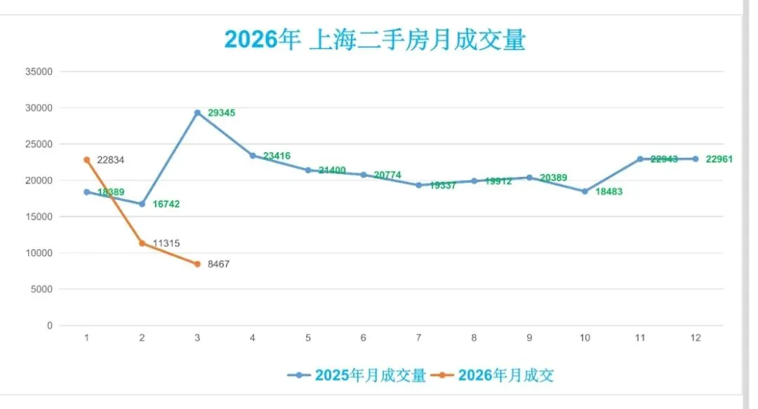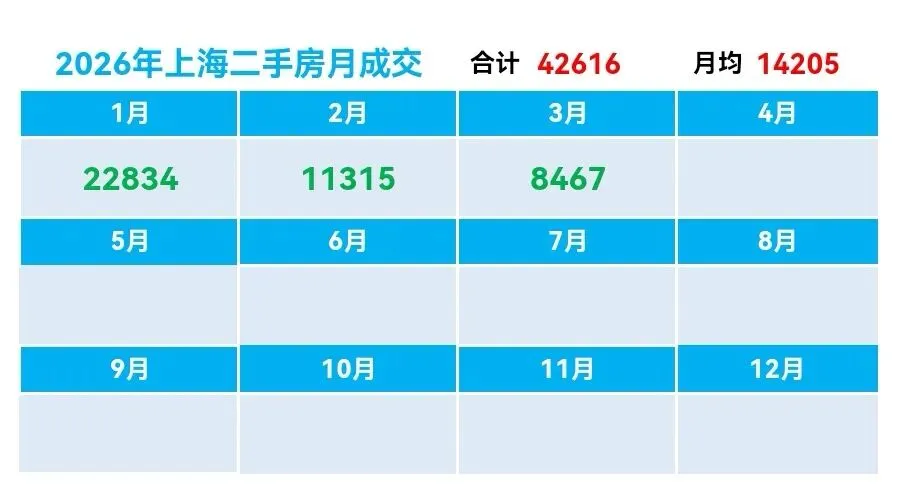 ♻️截止2026年3月10日,2026年上海二手房成交量合计42616套,月均21174套。