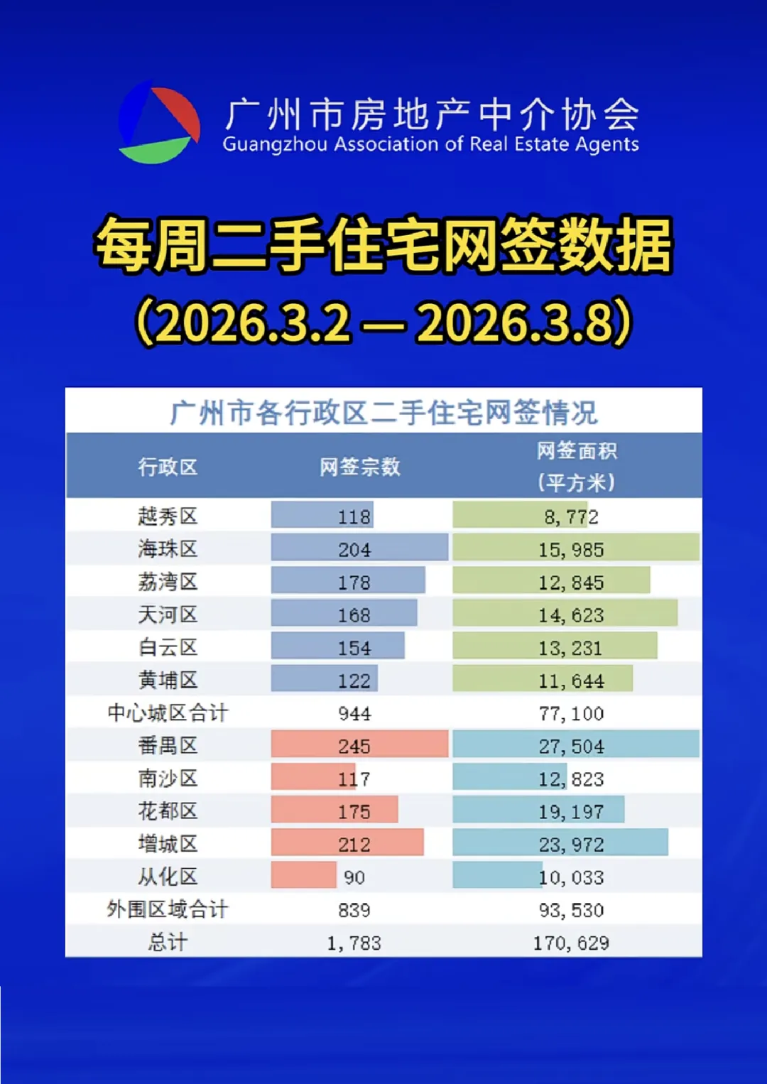 2026年3月2日~2026年3月8日(数据来源:广州市房地产中介协会),广州存量二手房累计网签1783 套,网签面积 170629㎡,比上周增加 XXX套,环比增幅(按宗数)XX%,各行政区成交量各有涨跌。