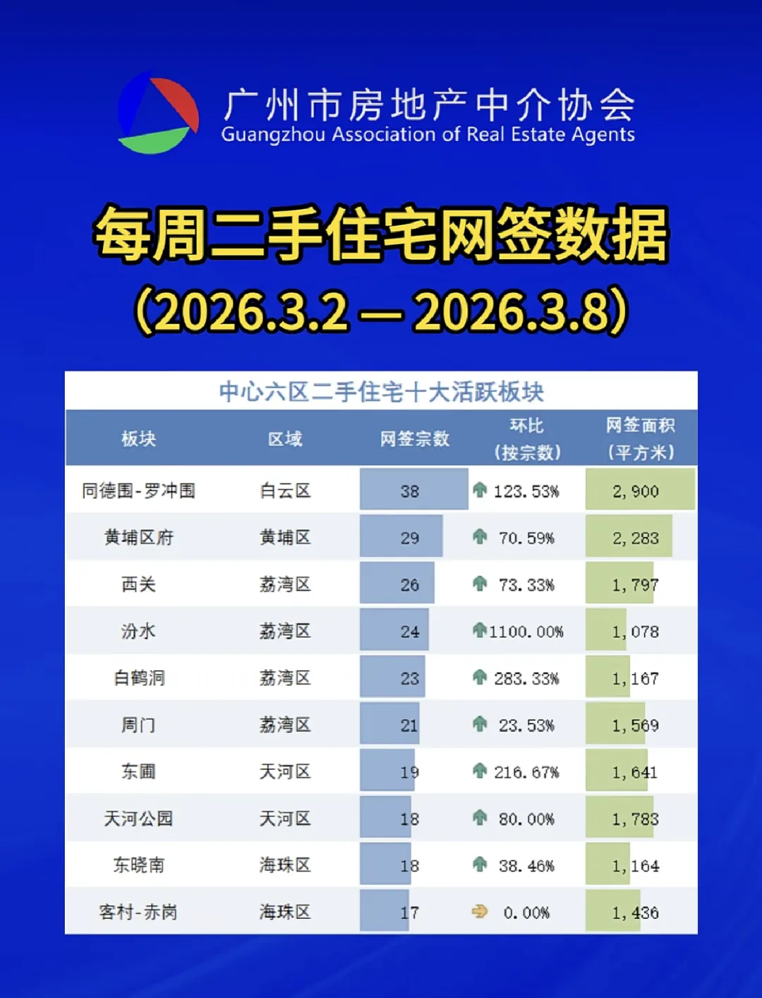 2026年3月2日~2026年3月8日(数据来源:广州市房地产中介协会),部分热点版块网签宗数大部分有所上涨。
