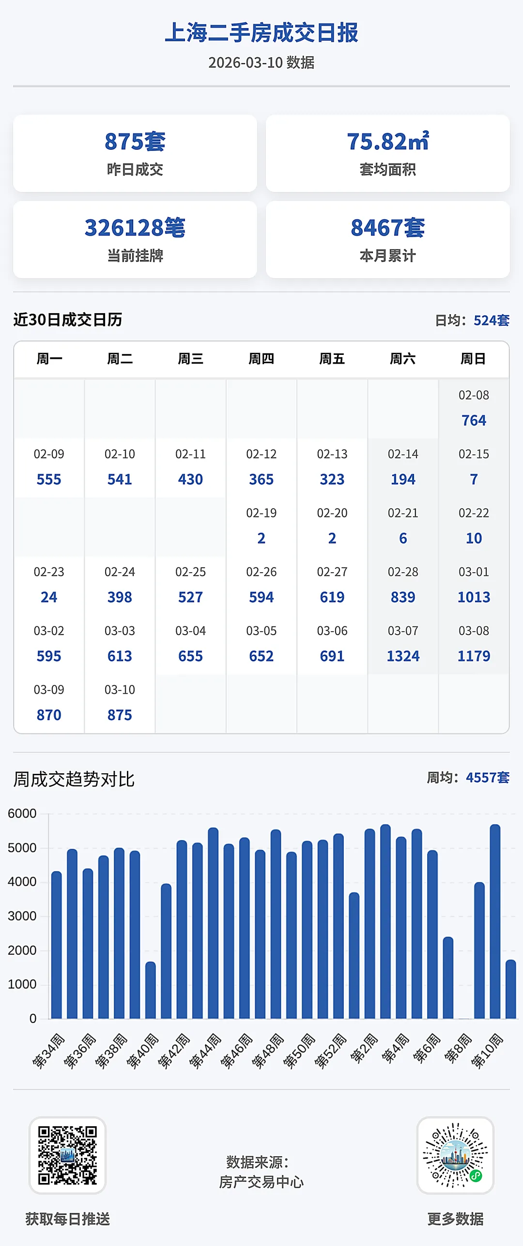 3月10日 周二,上海新房和上海二手房成交量合计1377套
