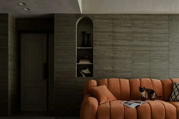 第一站,来到了家的心脏区域:客厅。在我们见到这间简约的客厅的时候,就深深爱上了它所散发出的典雅气韵。设计师Amy在这间客厅里,没有过多的铺陈,没有多余的坠饰,没有过分的矫饰,有的是一张橙色的柔软沙发,与胡桃木的墙面与橱柜。值得一提的是,这张橙色的沙发,是最近一款叫好又叫座的单品,它以活力的色彩,舒怡的坐感,和优雅的造型,而受到了广泛地青睐了。我们入座了,瞬时感到一种舒展的体验,真是令人身心惬意。而胡桃木的墙面上,设计师Amy精巧设计了一处陈列柜,将几件Bella收藏的艺术品,放置其中了。这里俨然是Bella卓越品味的韵脚了,澹雅的艺术气韵在这里被荡漾而出了。这个客厅里,绕显出四射的活力,也在简洁之中,流露出了生动迷人的画卷来。可以说,这间客厅,它无需赘言,它是家的第一中心区域了。
