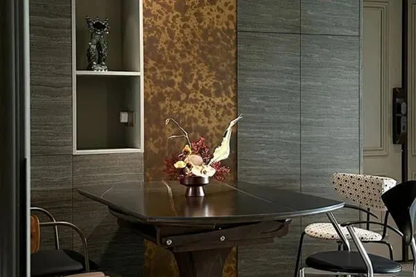移步到了餐厅区域。餐厅的面积不大,但是,就是在这方寸天地里,设计师Amy也进行了匠心的设计了。设计师Amy将一张肌理细致均衡的黑色大理石餐桌,与四张造型各异的餐椅,与一面精致的橱柜,一同组合而成了一隅瑞丽端庄的用餐空间了。有趣味的是,在墙面上,设计师Amy再一次设计了一个陈列部分,将小巧的雕塑放置着,设计师Amy说:“现代家庭的装饰元素,已经从过去的绘画为主,变为以雕塑为主了。”然而,这张尔雅的餐桌,在将它圆角处理之后,又辅以了精湛的手工艺的打磨,让人欣喜地与传统工艺进行了一次趣味的对话。这是现代设计与传统工艺的共舞,在此,织就了一幅迷人的用餐画卷。当Bella与好友们在此相聚,在觥筹交错之间,尽享着人间美食,也在此营造出了舒怡的社交氛围。这餐厅俨然是家里又一处中心空间,悄然伫立起了家的优雅质感。