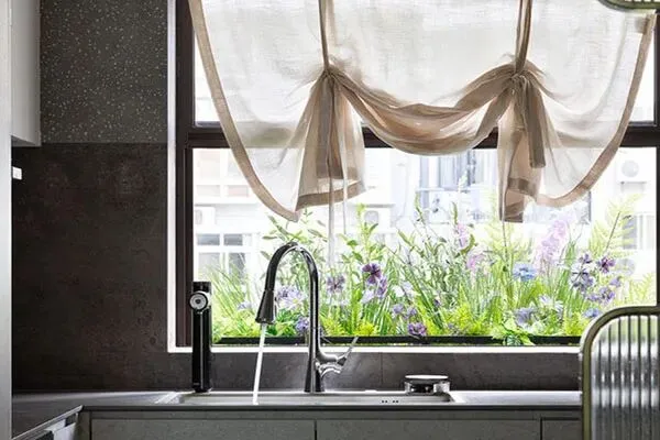 稍走了几步,来到了厨房空间。厨房的面积不小,设计师Amy也在这里颇费了匠艺。在U字型的结构里,以精巧的橱柜,靓丽的灶具,考究的五金之中,勾绘出了利落硬朗的烹饪空间。设计师Amy又将所有的智能厨电,无缝嵌入了橱柜之中,彰显出现代无缝美学的经典理念。有意趣的是,在这间厨房里,有着一面窗户,设计师Amy在窗外放置了一排鲜花与绿植,正如林语堂先生所言:“什么是美好的空间?是你有一扇窗,能在室内的时候,一边忙着,一边看到外面的景色了。”在这间风景雅致的厨房里,一半生活家,一半桃花源,让人徜徉在烹饪饕餮可口美食的乐趣之中了。厨房,它叙述了家的优越感。