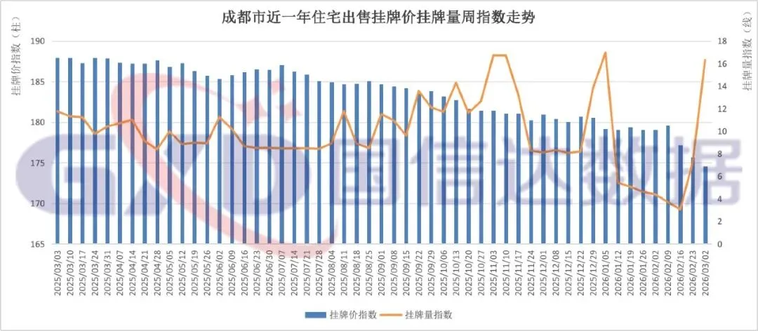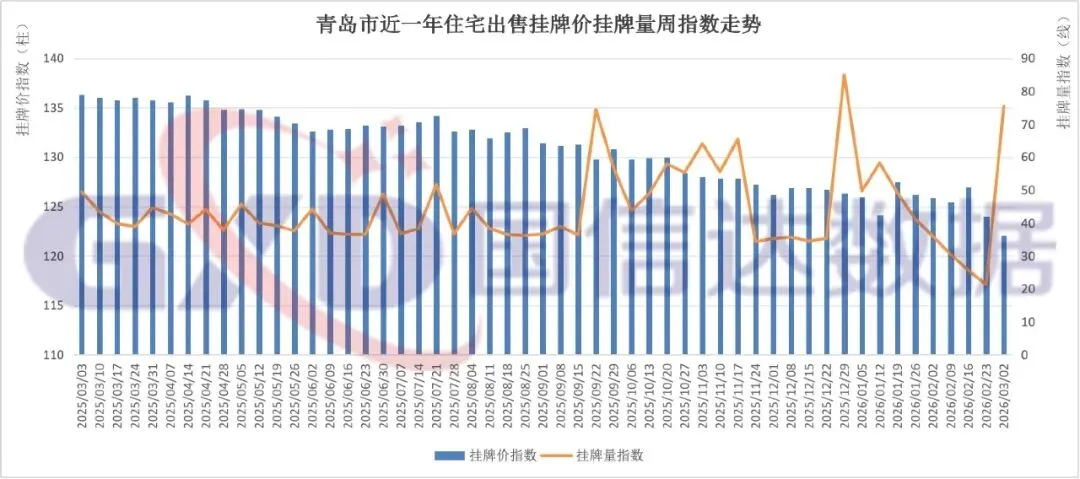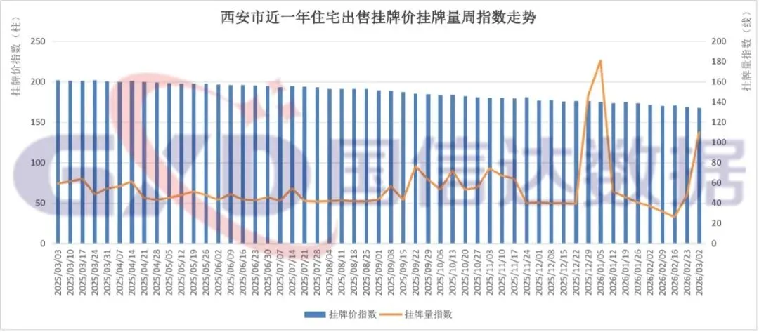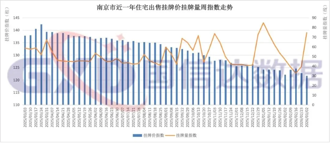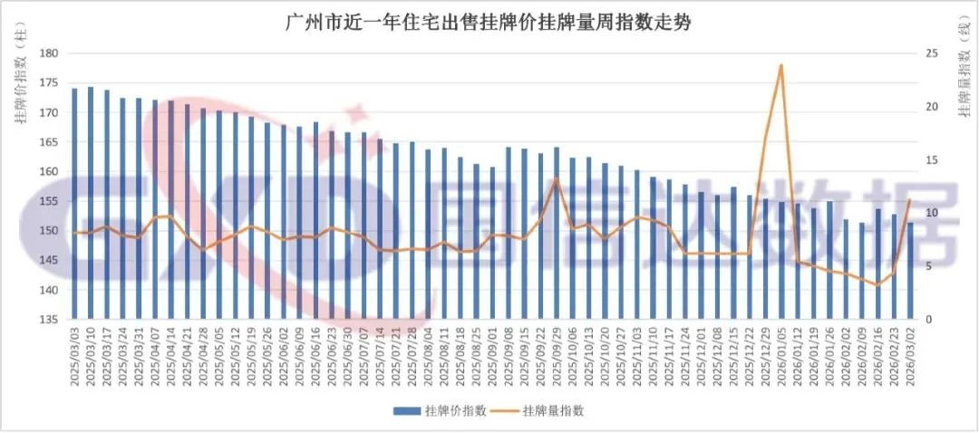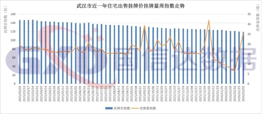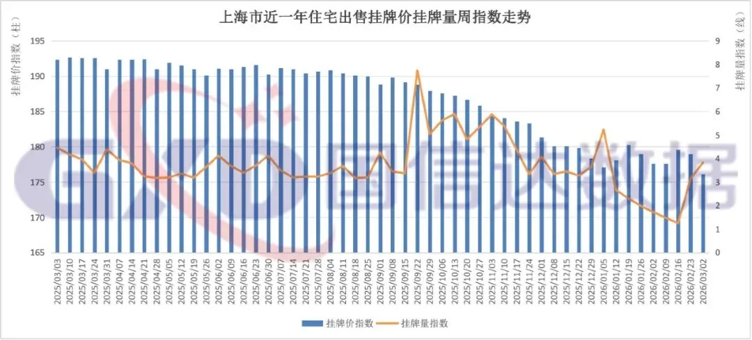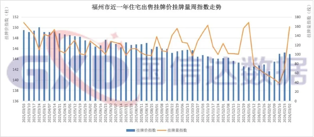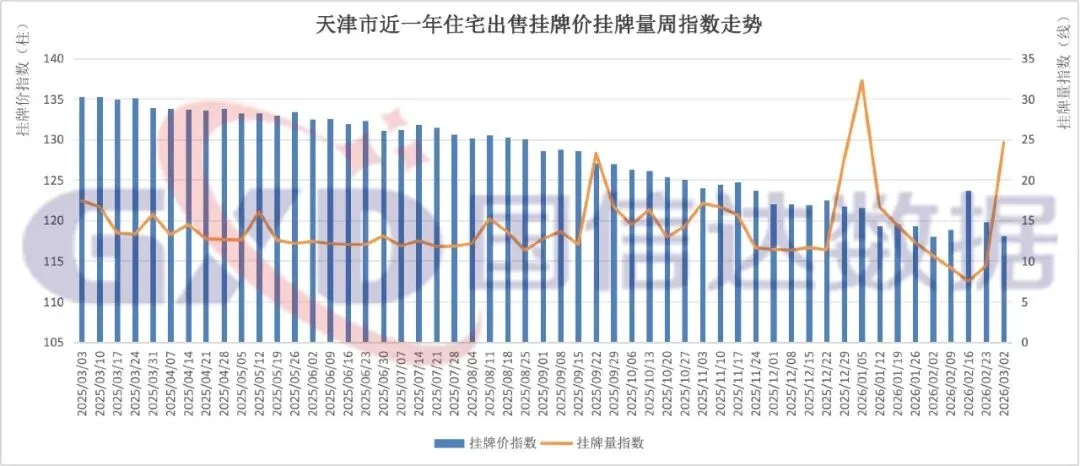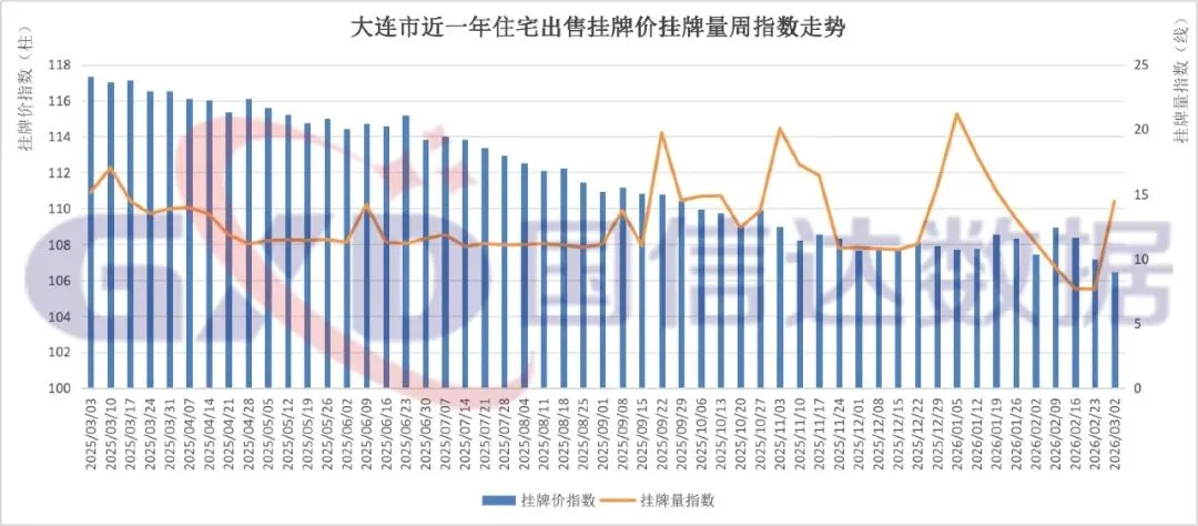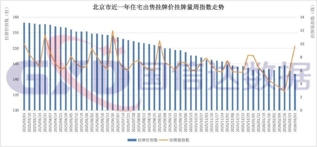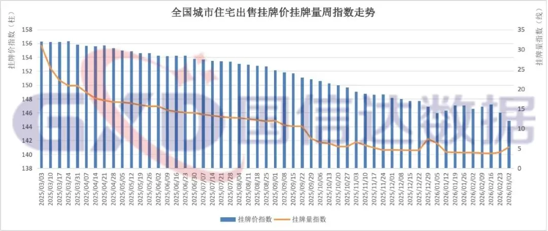 2026年第10周,全国住宅出售挂牌价指数144.87,环比下降0.79%;挂牌量指数5.32,环比上涨33.73%。