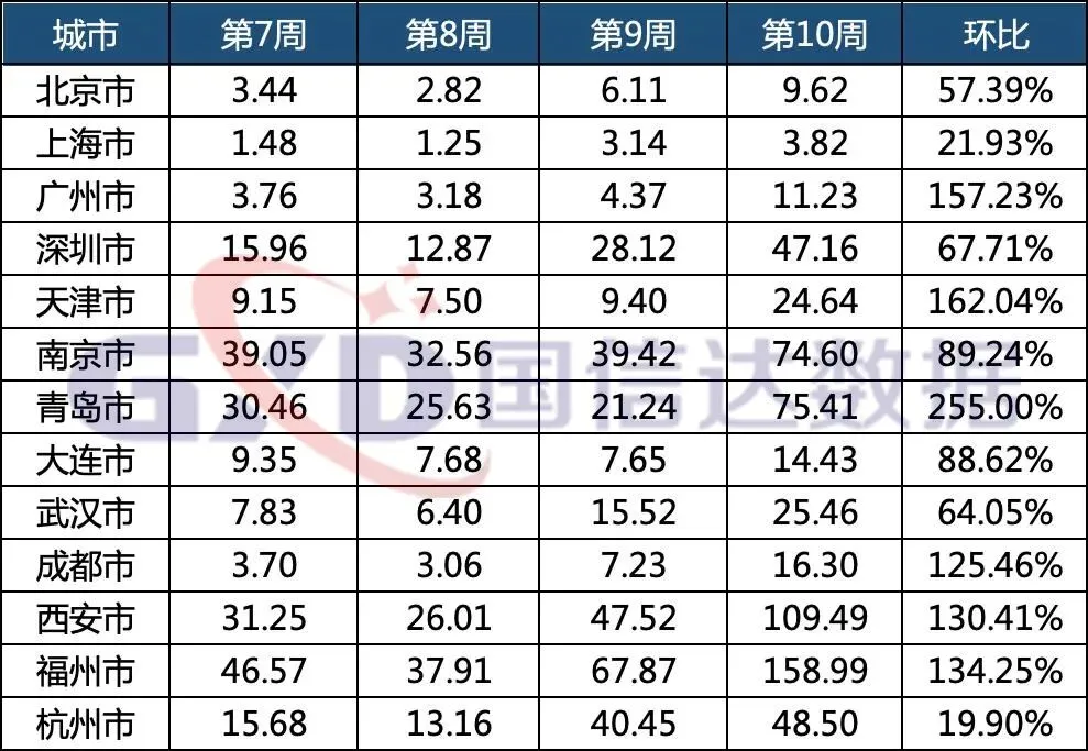 北上广深四个一线城市,北京市挂牌量指数环比上涨57.39%,上海市挂牌量指数环比上涨21.93%,广州市挂牌量指数环比上涨157.23%,深圳市挂牌量指数环比上涨67.71%。