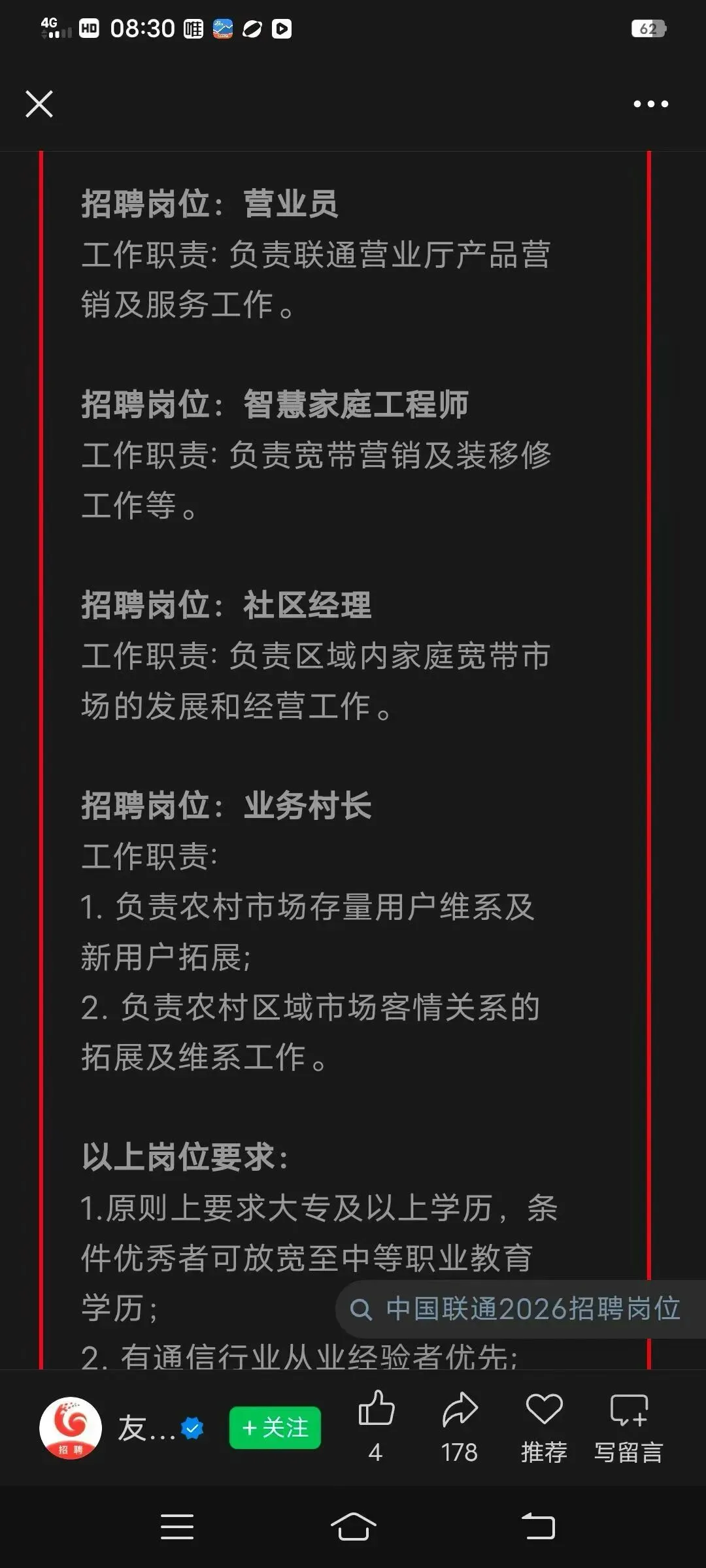 代友转发:招联通营业厅营业员,有意向可致电18607669981梁经理