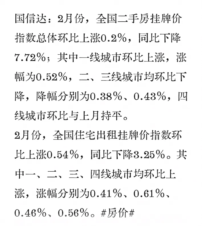 >2月二手房价格指数出炉:一线微涨,二三线遇冷,出租市场全线飘红