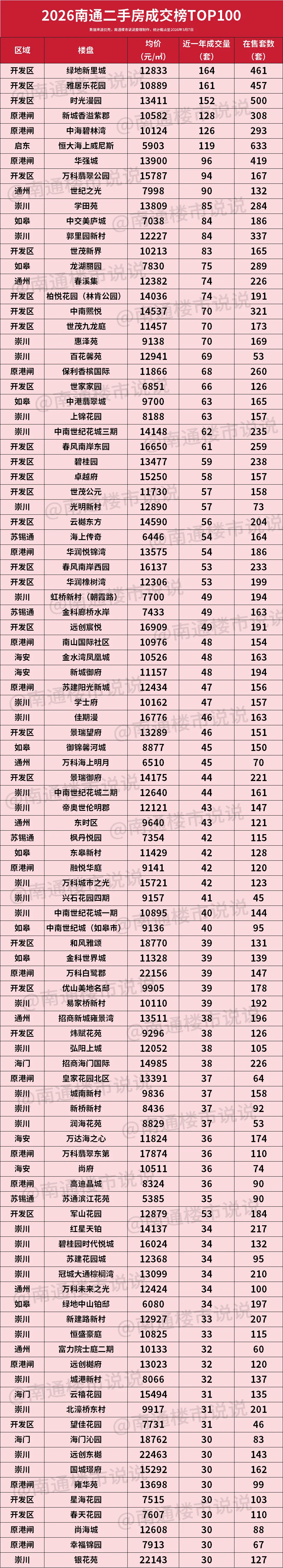 最新!2026南通二手房成交榜TOP100发布!