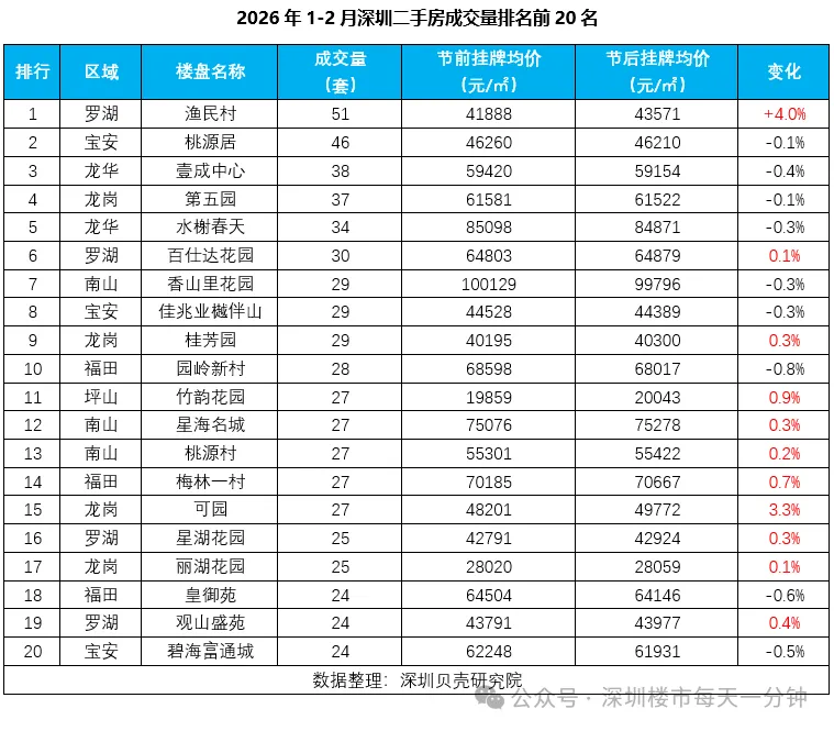 更值得关注的是价格端的信号。过去两年,深圳二手房均价从2023年的7.2万/㎡跌至2025年底的6.5万/㎡,跌幅近10%;但2026年开年,成交均价连续两个月止跌,甚至部分热点楼盘的挂牌价开始“抬头”。据深圳贝壳研究院统计,二手房成交量排名前20的楼盘中,