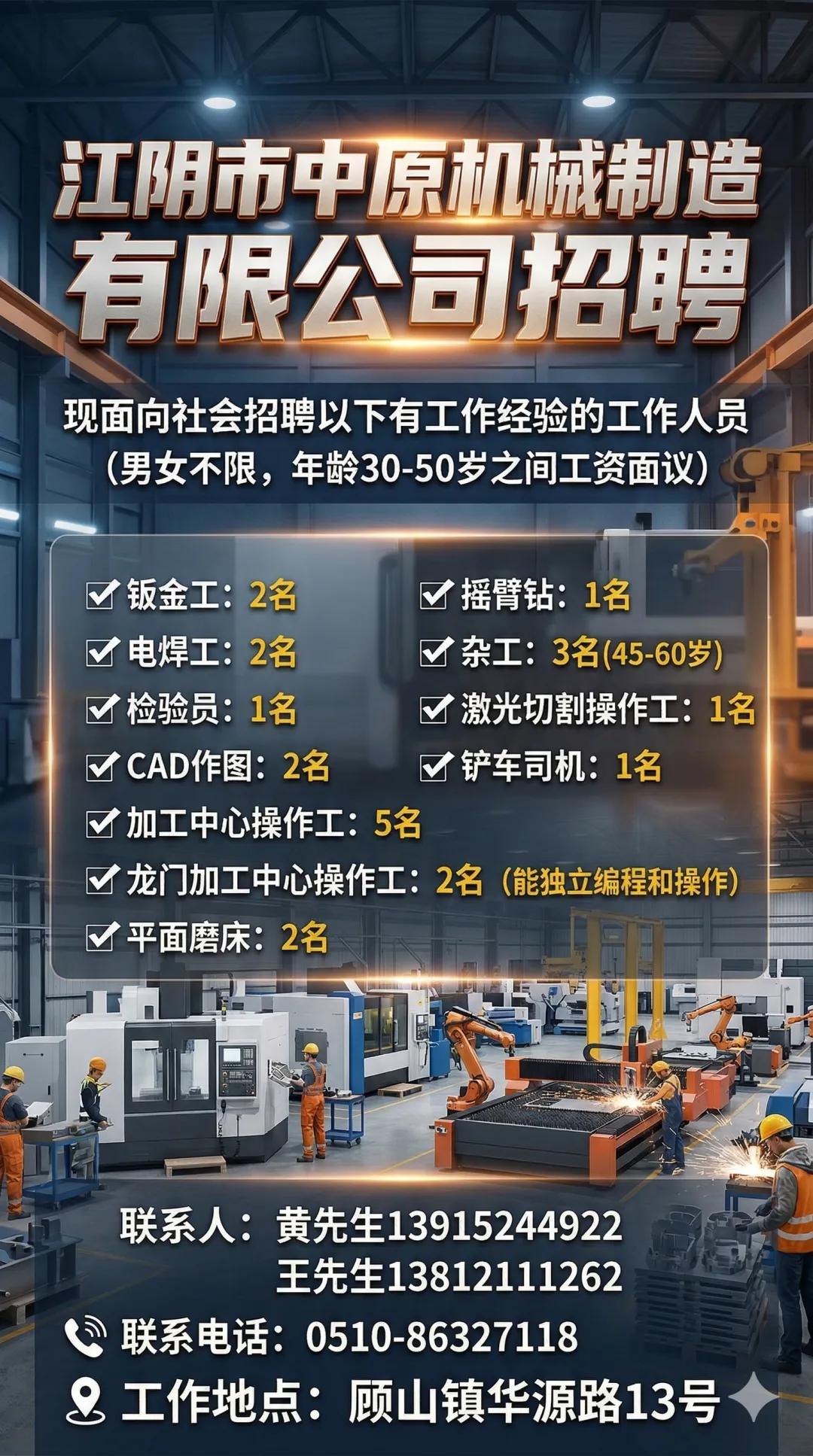 ✅龙门加工中心操作工:2名(能独立编程和操作)