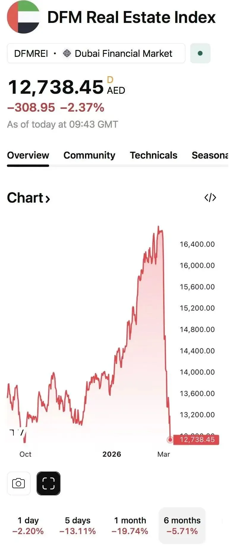 我刚扫了一眼迪拜房产指数DFM Real Estate Index,一周跌去了20%,基本已经抹平了半年涨幅。