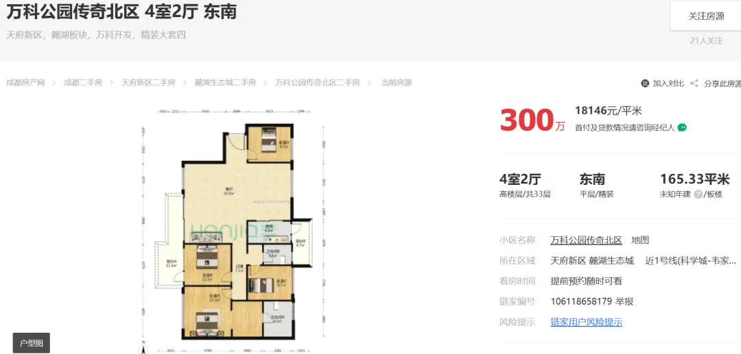 2026年03月10日,据市场端消息:成都天府新区麓湖,万科公园传奇北区建面165平套四报价300万;目前房东心里价在300万愿意出售。