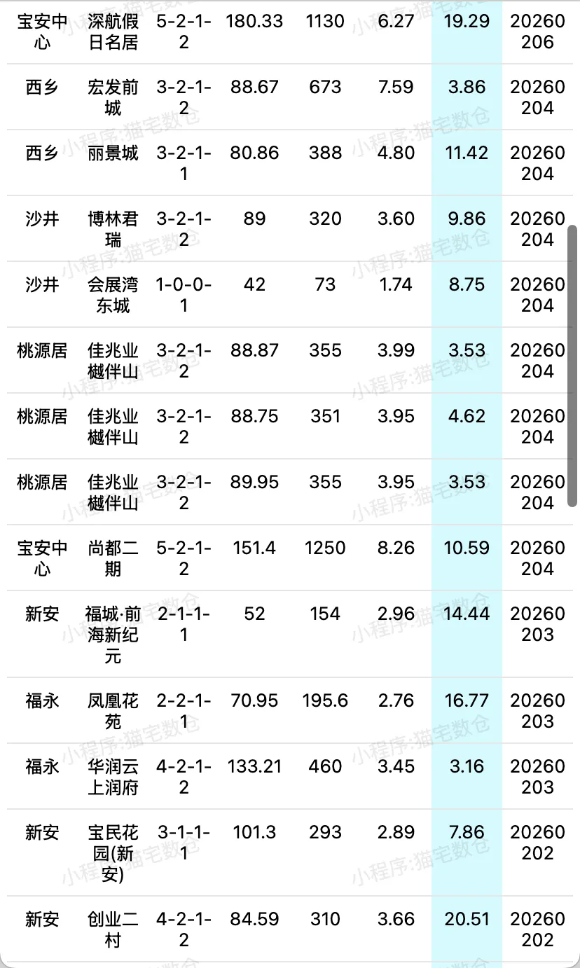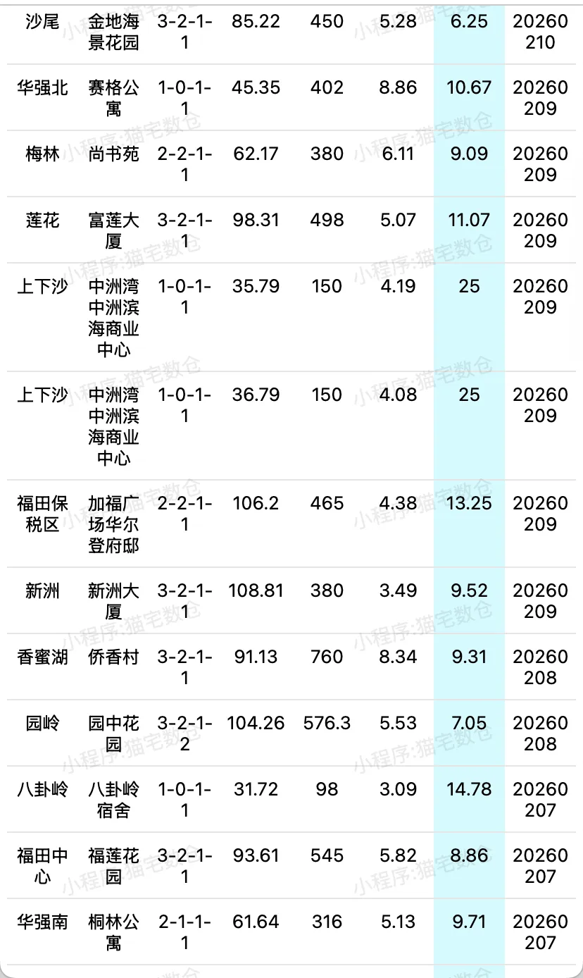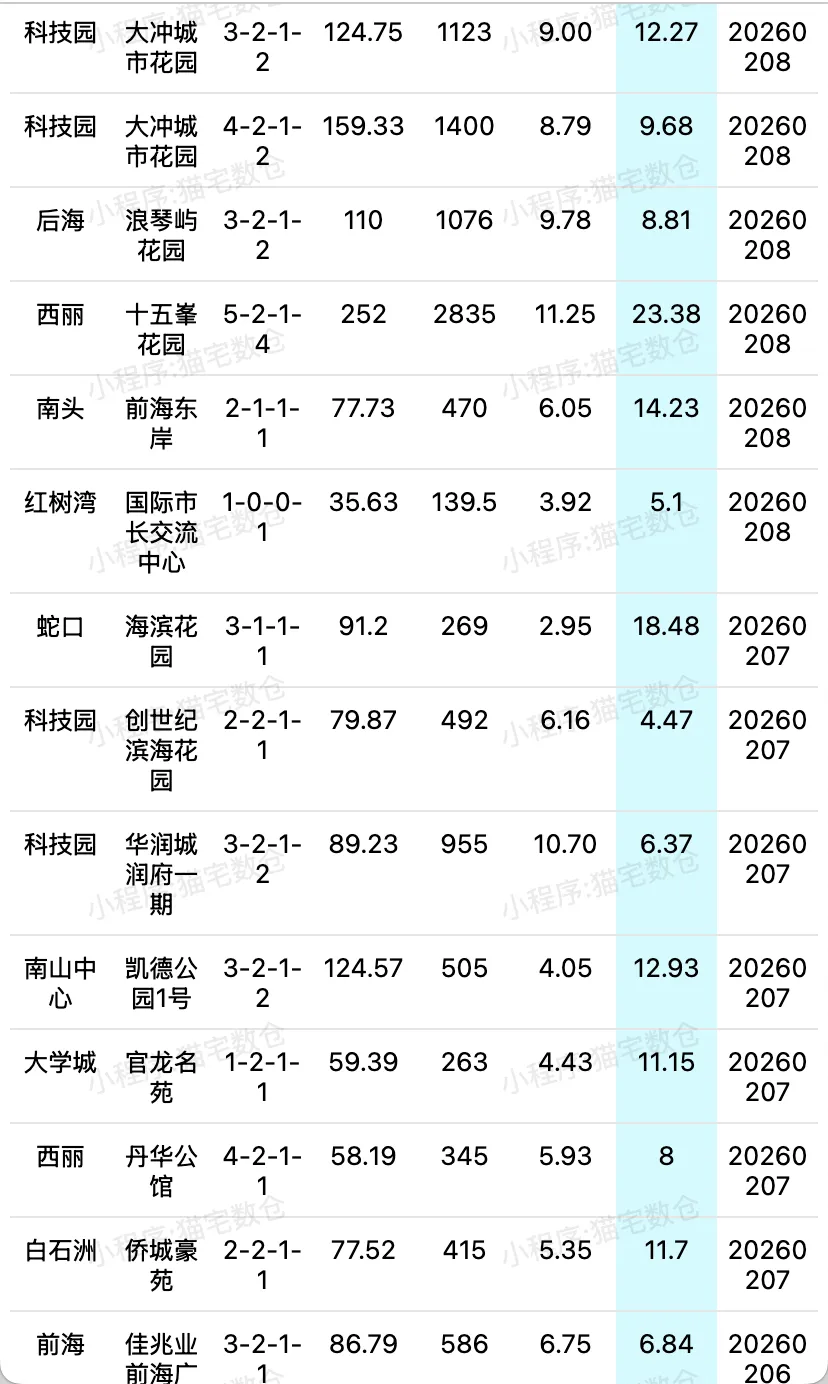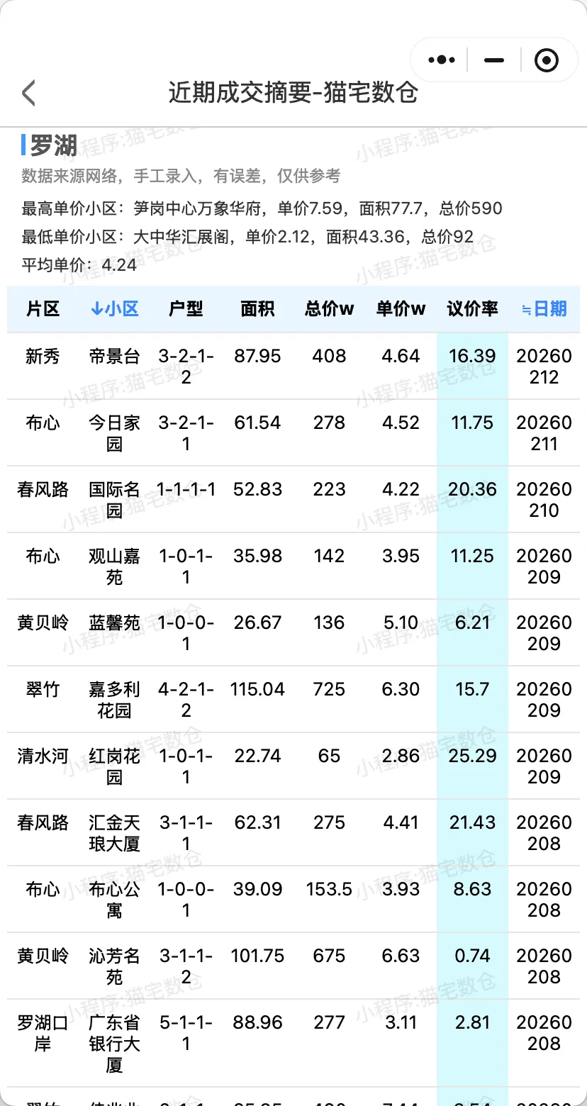 最高单价小区:笋岗中心万象华府,单价7.59,面积77.7,总价590