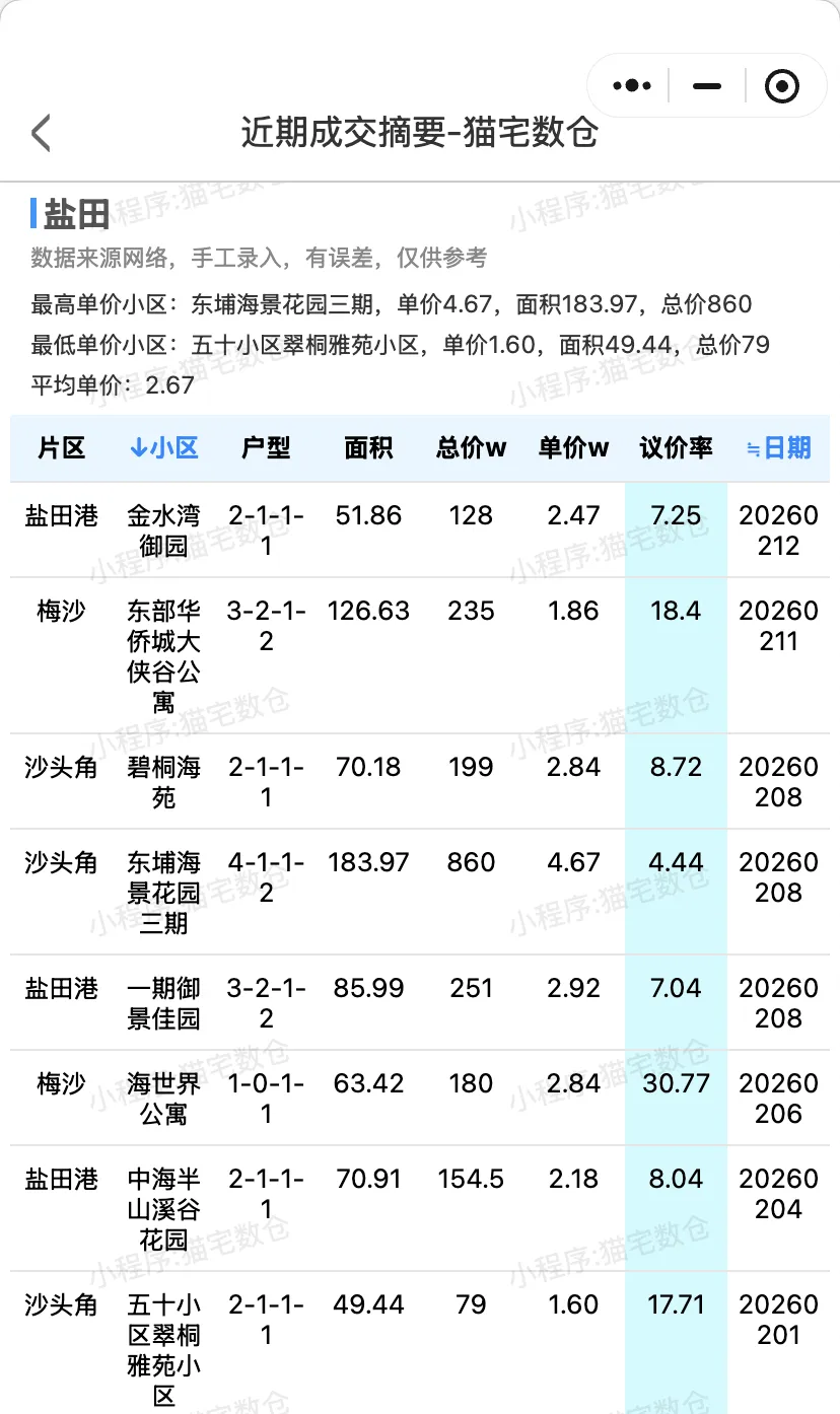 最高单价小区:东埔海景花园三期,单价4.67,面积183.97,总价860