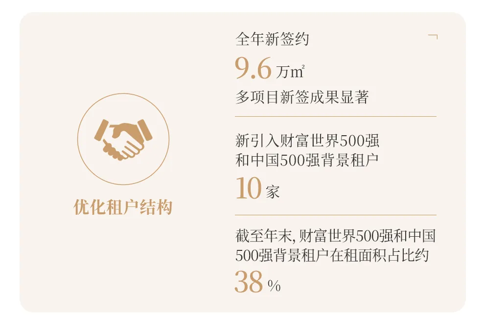 以产品优化与资源协同双轮驱动,深化租户结构优化与品牌建设互促提升,助力资产稳健穿越周期,实现高质量发展。2025年,写字楼实现收入9.86亿元,核心指标稳健。