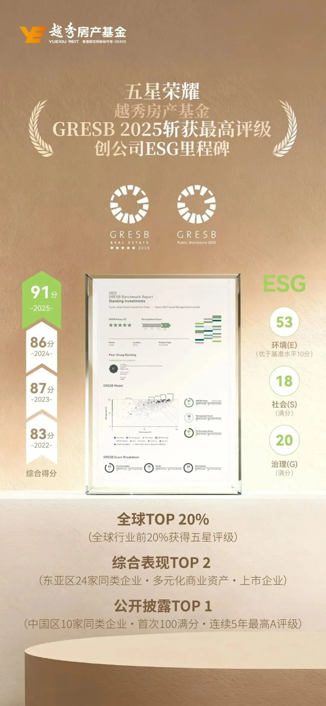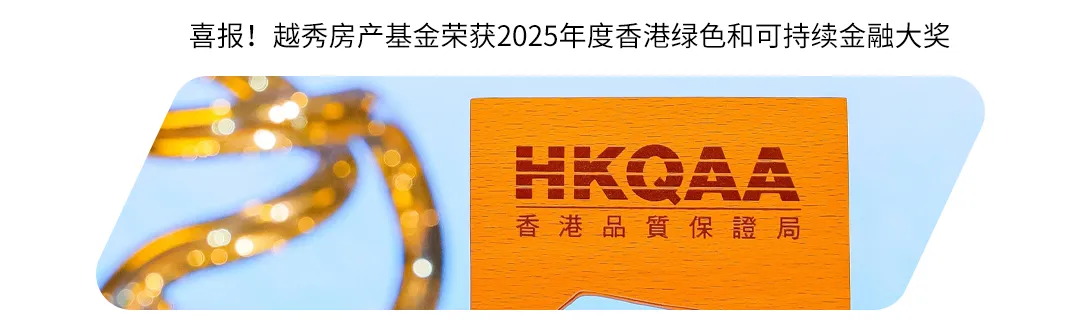 凭借卓越的可持续发展实践,基金国际评级持续进阶。在2025年全球房地产可持续标准(GRESB)评级中,首次获得最高绿色五星评级及“全球行业领导者”称号,再次获得公开披露最高A评级,香港品质保证局可持续发展评级提升至“A”级,标普CSA评分领先全球87%同业,同时斩获“2025年度香港绿色和可持续金融大奖”等多项荣誉,可持续发展实力获国际权威认可。