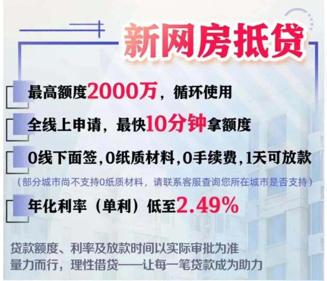 新网银行-好事贷是一款全线上即可办理的个人房产抵押贷款产品,经营或消费用途均可,支持全款房、按揭房、抵押房,最高额度2000万,循环10年可用,年利率(单利)低至2.49%,覆盖全国近200个城市!