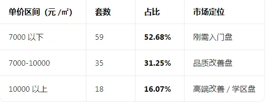 - 7000 以下:约 38 套,占两室总量的 61.29%(刚需两室为主)
