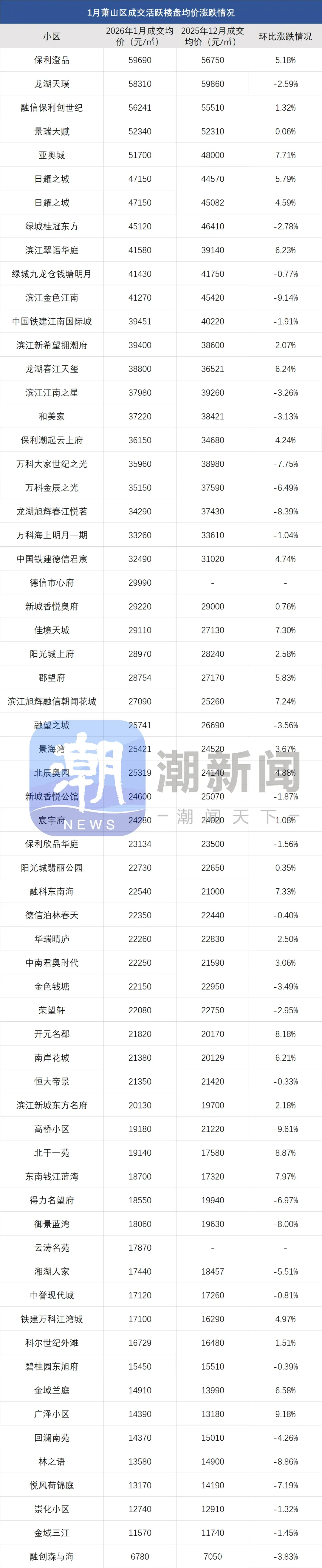 涨跌榜数据中,分化随处可见。以热门板块钱江世纪城为例,涨幅前几位和跌幅前几位并存。金色江南1月成交均价为41270元/㎡,环比下跌9.14%;世纪之光成交均价35960元/㎡,环比下跌7.75%。而同板块的亚运村亚奥城、日耀之城,还有保利澄品,1月成交均价环比分别上涨了7.71%、5.79%和5.18%。