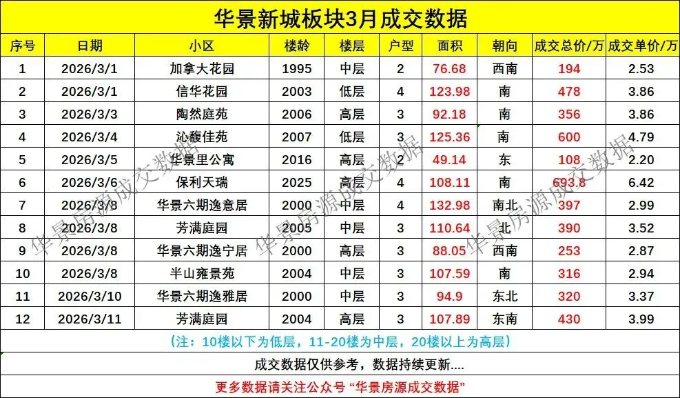 华景板块二手房成交明细,最近成交3房为主,刚改客户出手加速...