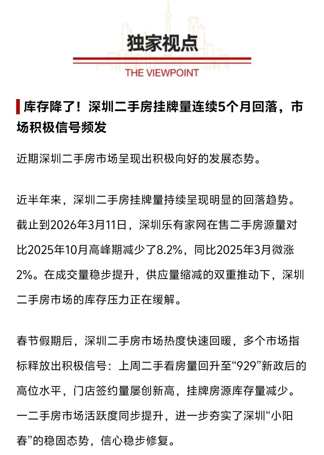 2026年开年以来,深圳楼市持续释放积极信号,二手房挂牌量连续回落、一二手成交稳步回暖、新房销售模式创新突破、法拍市场热度不减。多重利好叠加,深圳楼市“小阳春”态势愈发稳固,置业信心全面修复。截至2026年3月10日,深圳一二手住宅网签数据新鲜出炉,市场活跃度持续攀升:- 一手住宅:预售网签345套,现售网签433套,累计778套节后深圳二手市场快速复苏,看房量回升至“929”新政后高位,门店签约量屡创新高,一二手房联动升温,为全年楼市稳健发展奠定坚实基础。📉 二手房市场|挂牌量连降5个月,库存压力显著缓解深圳二手房市场迎来关键转折,挂牌量连续5个月回落,从供应端缓解市场压力:- 截至3月11日,乐有家网在售房源较2025年10月高峰期减少8.2%- 同比2025年3月微涨2%,市场回归理性平衡状态成交量稳步提升、供应量持续收缩,双重作用下深圳二手房库存压力大幅缓解。业主报价更理性、买家入市更积极,市场从“以价换量”逐步转向量升价稳的健康格局,刚需与改善型需求同步释放。🌟 楼市创新|深圳首个「价格全透明」楼盘官宣,告别返佣套路3月11日,龙华中心区金地启曜府联合乐有家,正式推出深圳首创**“价格全透明、拒绝返佣套路”**销售模式,重塑新房交易规则。2. 严禁任何形式额外折扣与返佣,坚守合规销售底线项目严控营销成本,砍掉灰色环节,让购房者直享底价,彻底规避“承诺不兑现”的购房风险。- 区位:龙华中心,近60万㎡壹方天地,5条地铁环绕- 产品:93-130㎡全南向3-4房,新规高舒适度户型- 门槛:总价420万起,首付63万起,刚需轻松上车这一创新模式不仅是房企诚信经营的体现,更推动深圳新房交易走向公开、公平、透明,为行业树立全新标杆。7层绿本法拍房,起拍价365.5万,38人竞拍、212轮出价,最终以1006.3万成交,溢价率175.3%,单价约13163元/㎡,高租金回报率成核心吸引力。2026年1-2月全国法拍住宅成交1.9万套,深圳以66.4%清仓率位居全国首位,核心资产认可度领跑一线。与此同时,内地买家持续入场香港楼市,2月香港住宅成交金额环比大涨23.1%;国内多城保障房租金打折,西安最高降50%,租赁市场趋于平稳。1. 信心修复:二手房库存下降、成交回暖,置业预期持续向好2. 模式创新:透明化销售打破行业潜规则,保护购房者权益3. 结构优化:刚需为主、改善跟进,投机需求出清,市场更健康对于购房者而言,现在是信息透明、选择多元、风险降低的置业窗口期;对于市场来说,规范化发展将长期利好楼市稳定。1. 购买新房请认准官方公示价格,警惕非正规渠道“返佣”陷阱2. 二手房可重点关注挂牌量下降、成交活跃的优质片区3. 法拍房需核实产权、税费、租约等细节,理性参与竞拍深圳楼市正朝着更规范、更健康、更透明的方向迈进,小阳春已至,稳健前行是全年主基调。每日更新笋盘和深圳房产相关,您的点赞与关注,化作我坚持创作的动力*^_^*💝💝💝