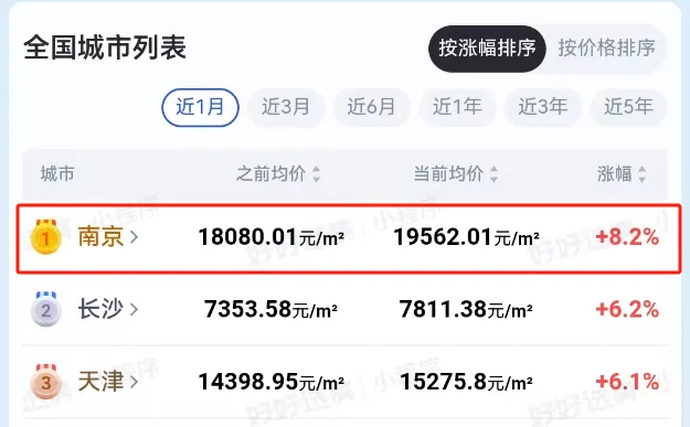 成交价格来说:据好好买房数据,南京房价近1个月均价从18080.01元/㎡涨至19562.01元/㎡,涨幅8.2%,位列全国第一!