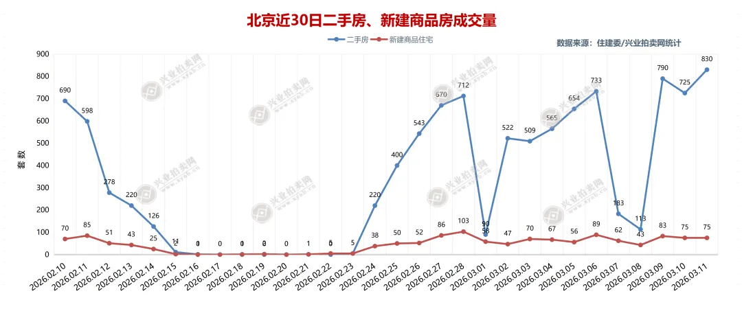 2026年3月11日北京二手房成交830套,本月累计成交5714套,其中住宅成交751套,本月住宅累计成交5188套,北京新建商品住宅成交75套,本月累计成交725套。