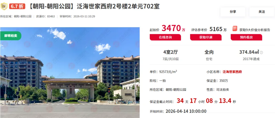 【朝阳-朝阳公园】泛海世家西府2号楼2单元702室泛海世家西府位于北京市朝阳区朝阳公园板块,地处东三环至东四环之间,紧邻朝阳公园,是区域内知名的顶豪社区。周边配套高端成熟,紧邻CBD核心区与使馆区,商业、教育、医疗资源均优,属于朝阳区重点发展的高端宜居与国际化生活板块。小区容积率2.1,绿化率35%,宜居属性强。周边配套:泛海世家西府衔接蓝色港湾、燕莎、SKP等高端商业体,便捷接驳地铁3号线石佛营站,同时紧邻东四环北路、机场高速等主干道,自驾通勤与日常出行高效无忧。邻近青苗国际双语学校、北京加拿大国际学校等优质国际化教育资源,文化氛围浓厚;周边首都医科大学附属北京朝阳医院、民航总医院等高端医疗资源为健康保驾护航;满足全维度高端生活需求!本次拍卖房产为泛海世家西府2号楼2单元702室的一套建筑面积374.84平米,4室2厅房产,采光优质,通透开阔。此次挂拍价为3470万,二手房市场评估参考价约5165万,相当于6.7折起拍,定于4月14日上午10时开拍,房屋相关信息已调查完成,可联系我们获取尽调报告及预约看房!