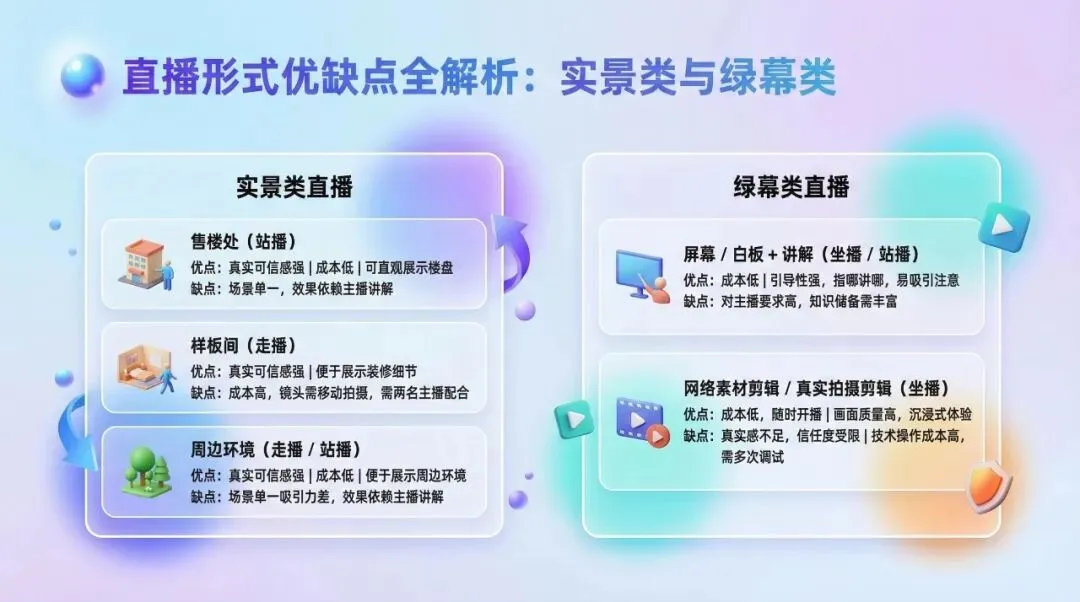 如果你是前期蓄客,要建立信任,优先选实景直播,用“真实”打消客户第一层疑虑。