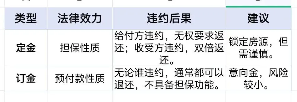 定金:担保性质,给付方违约,无权要求返还;收受方违约,双倍返还。 锁定房源,但需谨慎。