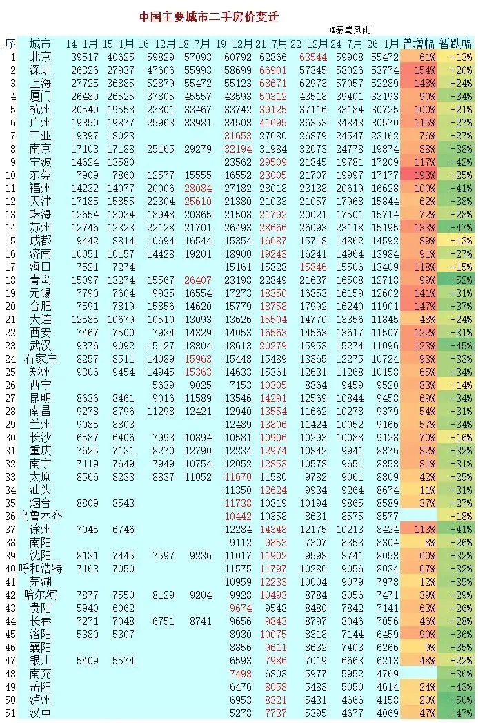 但总体上看,大部分大中城市的房价顶峰出现在21年,目前全部回调至少5年半了。少数城市的顶峰出现在18年、20年。
